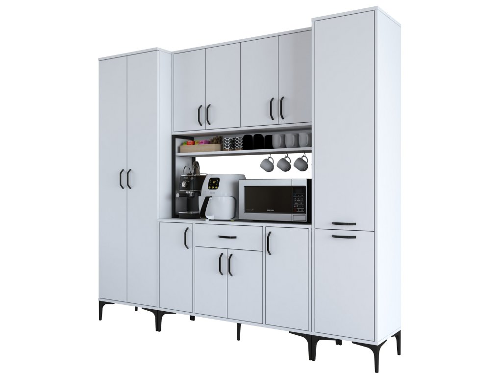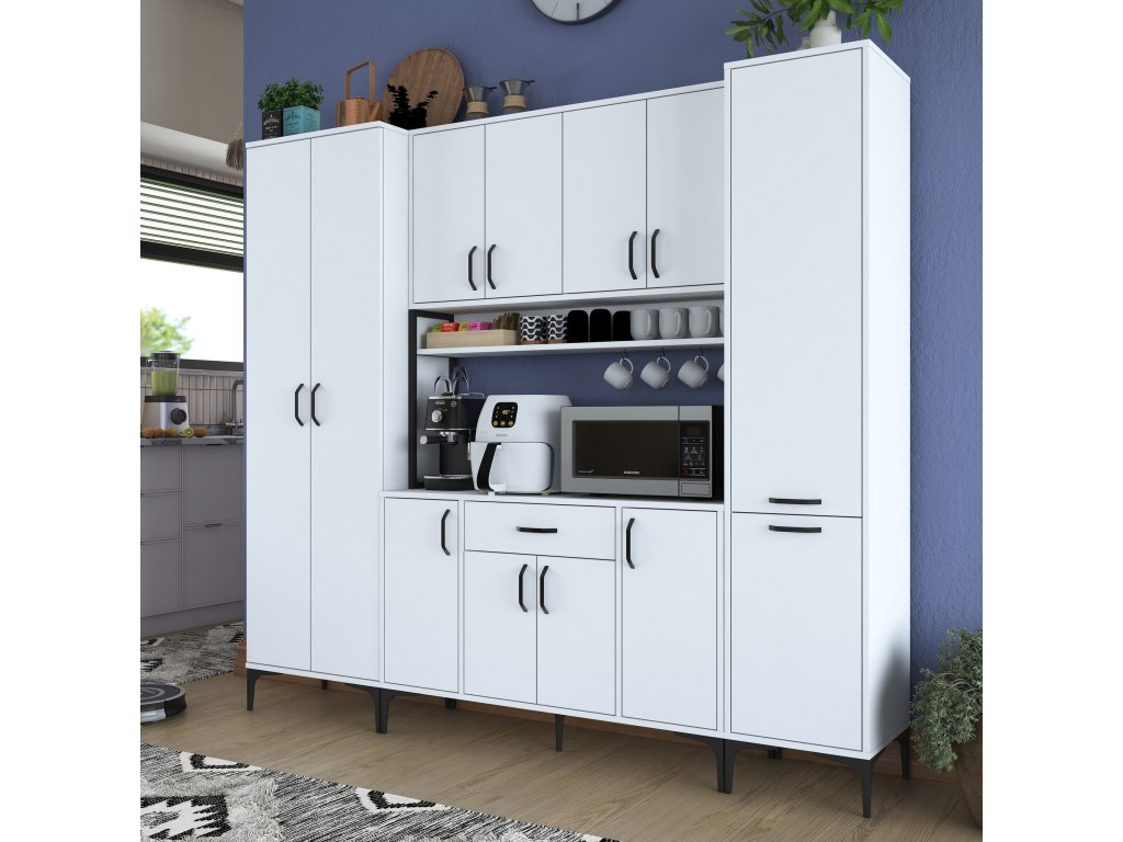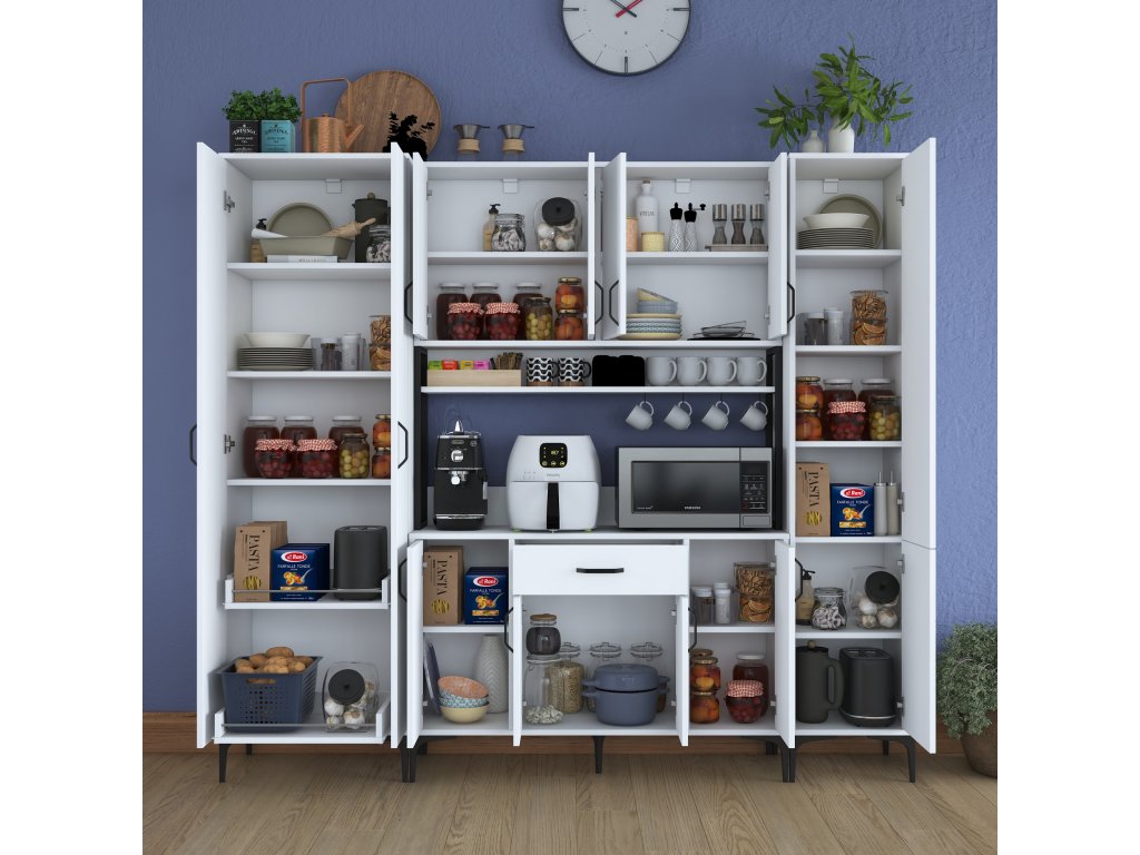 Skriňa ELECTRIC je navrhnutá tak, aby poskytovala maximálny úložný priestor. Obsahuje desať plných dvierok, jednu zásuvku a praktický regál, ktorý je ideálny na umiestnenie mikrovlnnej rúry alebo ďalších kuchynských spotrebičov. Jej viacúčelový dizajn vám umožní efektívne organizovať riad, kuchynské potreby a ďalšie príslušenstvo.