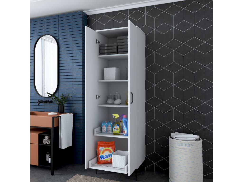 Skriňa TOMMY ponúka dostatok úložného priestoru vďaka dvojici plných dvierok, za ktorými môžete bezpečne uschovať uteráky, čistiace prostriedky alebo iné kúpeľňové doplnky. Jej výška umožňuje efektívne využitie priestoru, a preto sa hodí aj do menších kúpeľní.