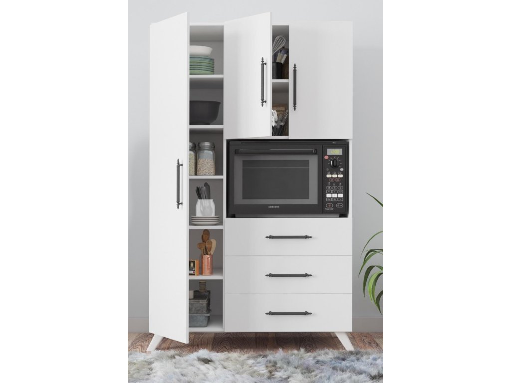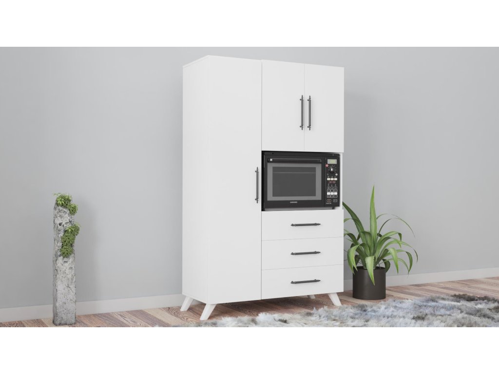 Skriňa ADELINE disponuje 3 dvierkami, 3 šuplíky a špeciálnym priestorom pre mikrovlnku, čo zvyšuje jej praktickosť. Tiež disponuje 5 priestrannými poličkami. Stojí na elegantných nôžkach, čo uľahčuje údržbu podlahy pod ňou. Vyrobená z kvalitnej drevotriesky potiahnutej melamínom, multifunkčná skriňa ADELINE zaručuje dlhú životnosť a jednoduchú údržbu.
