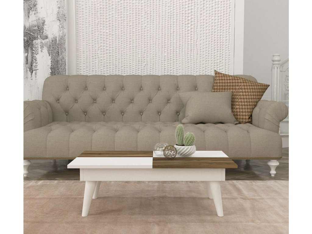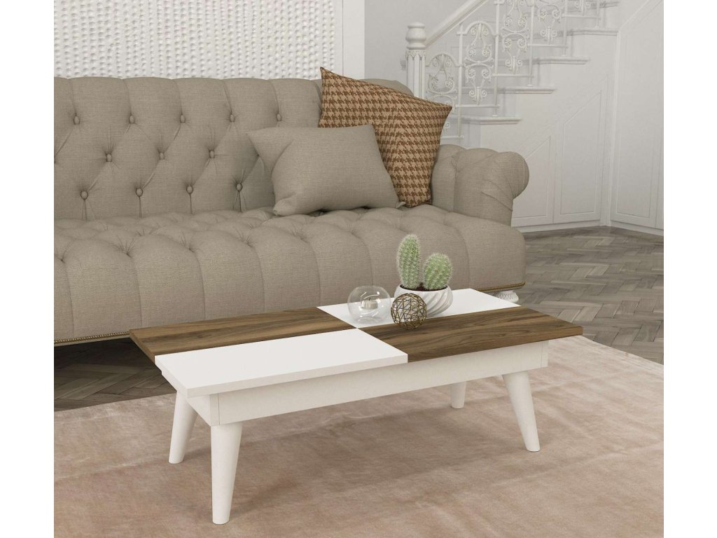 Stolík STRUM ponúka priestrannú plochu pre vaše kávové šálky, knihy alebo dekorácie. Kombinácia bielej a orechovej farby dodáva stolíku moderný a elegantný vzhľad, ktorý ľahko zapadne do rôznych interiérových štýlov.