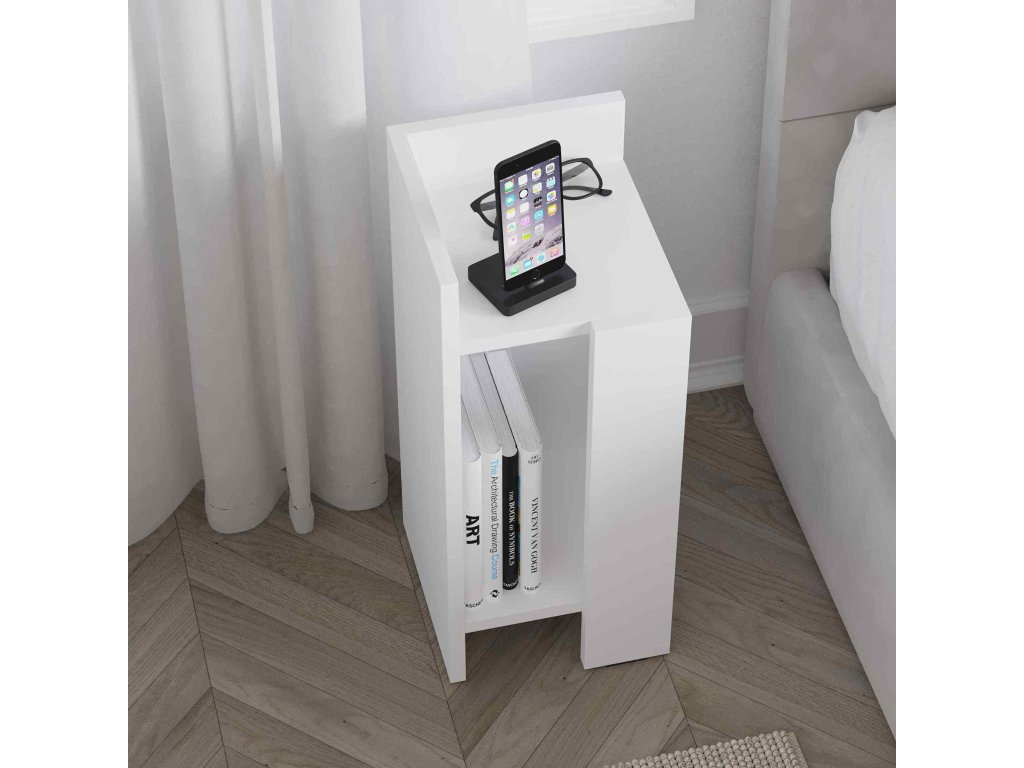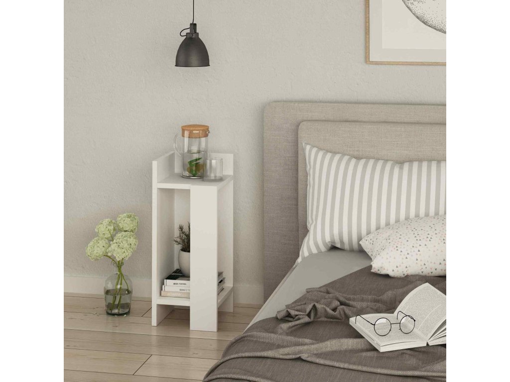 Predstavujeme vám GAUNT, nočný stolík, ktorý kombinuje modernú estetiku s praktickosťou. V jemnej bielej farbe dodá vašej spálni sviežosť a súčasne ponúkne funkčný priestor vďaka svojej odkladacej polici.