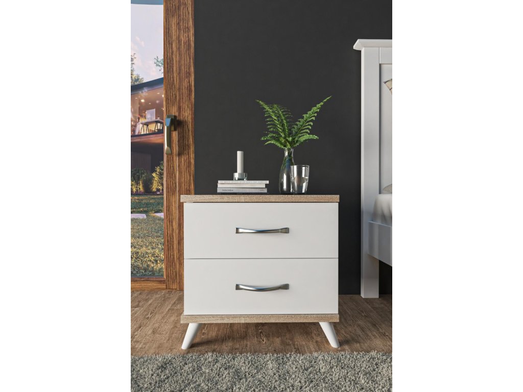 Nočný stolík je vybavený 2 priestrannými šuplíkmi, ktoré poskytujú dostatok úložného priestoru pre vaše osobné veci. Stojí na elegantných nožičkách, čo uľahčuje údržbu podlahy pod ním. Vyrobený z kvalitnej drevotriesky potiahnutej melamínom, stolík HARBOR zaisťuje dlhú životnosť a odolnosť.