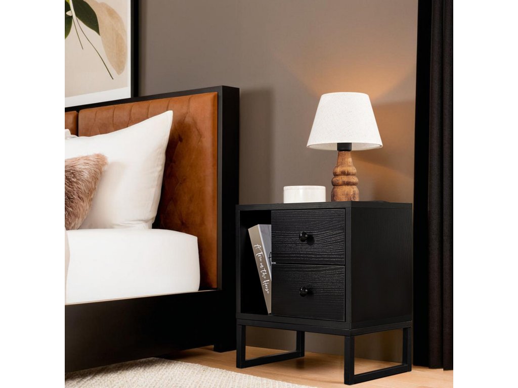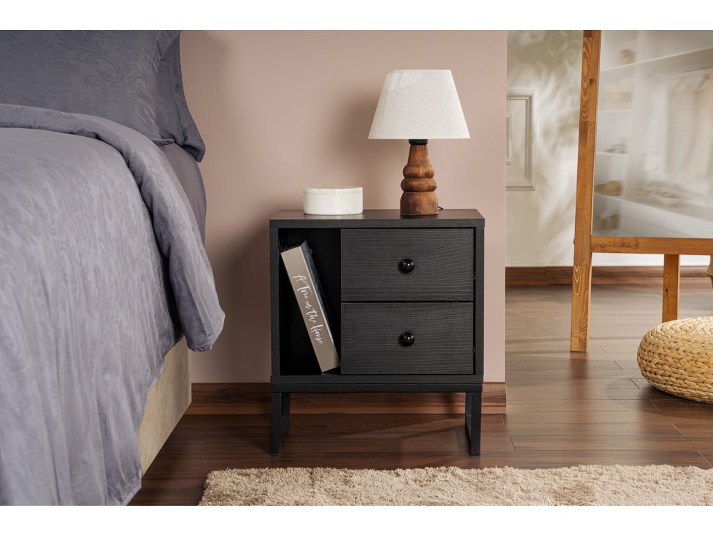Premeňte svoju spálňu na útočisko štýlu a funkčnosti s naším elegantným a moderným nočným stolíkom. Tento nočný stolík, vyrobený zo 100% drevotriesky s melamínovým povlakom, je nielen odolný, ale aj neuveriteľne štýlový. Elegantná kombinácia drevenej čiernej a čiernej farby dodá každému interiéru spálne nádych sofistikovanosti a stane sa tak perfektným doplnkom vášho priestoru.