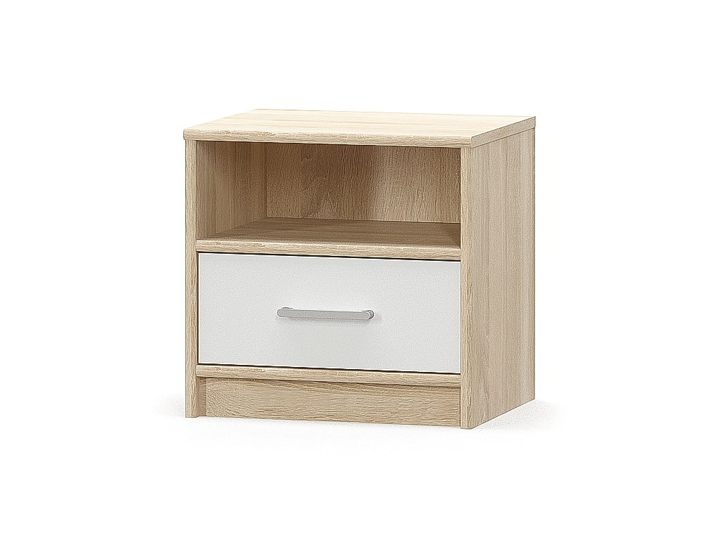 Nočný stolík OLINO je výbornou voľbou pre Vašu spálňu či detskú izbu. Vyrobený je z kvalitnej LTD dosky vo farebnom prevedení dub Sonoma/biela matná, ktoré sa hodia do akéhokoľvek interiéru.