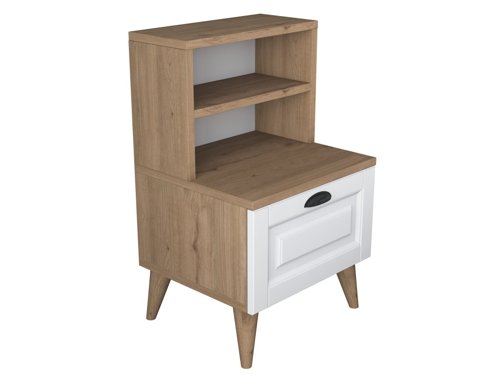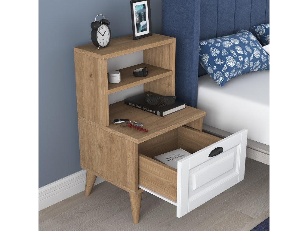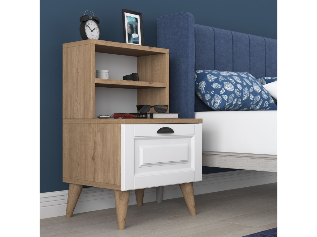Nočný stolík MABEL je dokonalým spojením elegancie a funkčnosti. Kombinácia bielej farby a dekoru orecha dodáva spálni moderný a útulný vzhľad, zatiaľ čo praktické usporiadanie zásuvky a regálku poskytuje dostatok miesta pre vaše nevyhnutnosti.