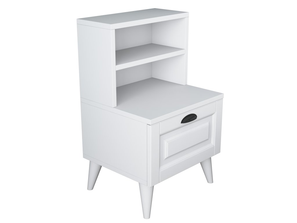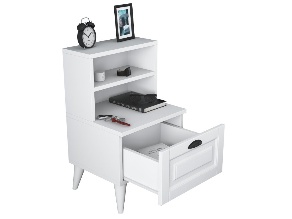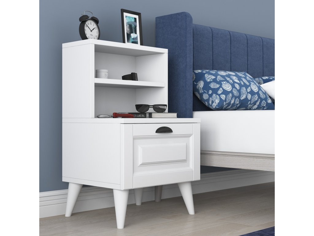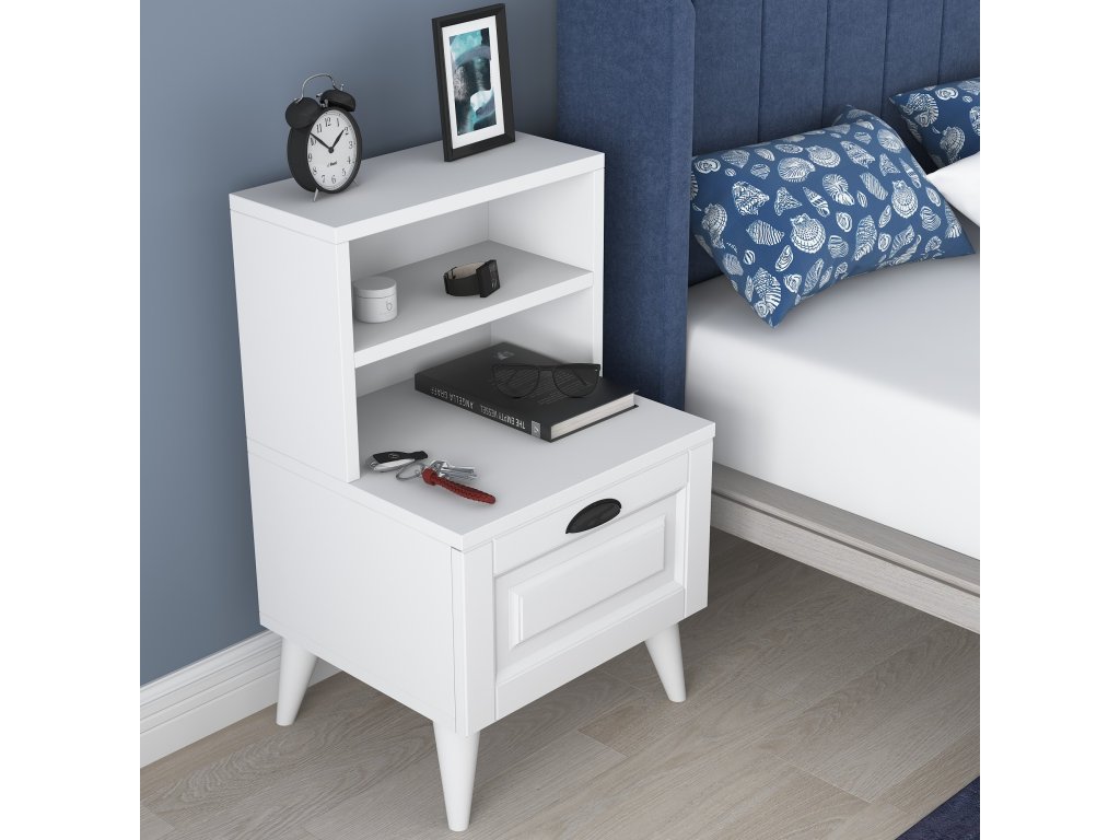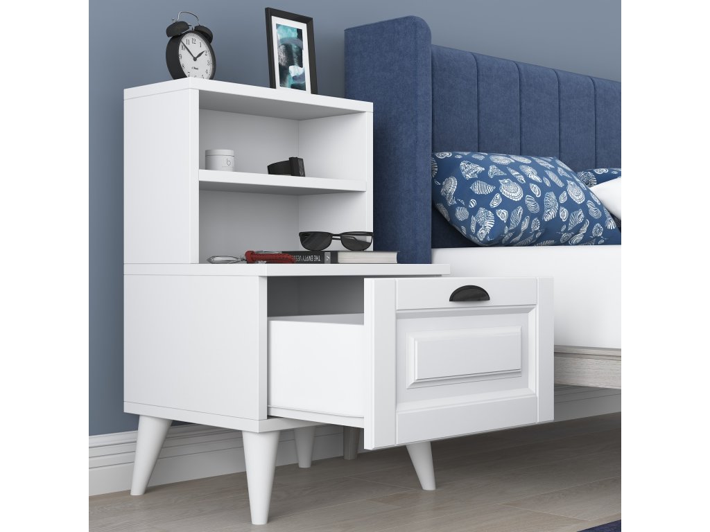 Nočný stolík MABEL ponúka inteligentné usporiadanie úložného priestoru a elegantný dizajn, ktorý zútulní vašu spálňu. Vďaka praktickej zásuvke a regálku budete mať všetko potrebné vždy po ruke.