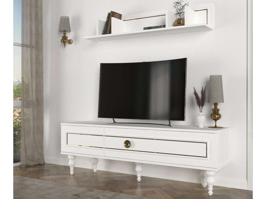 - Rozmery: TV stolík (150 x 35 x 48,9 cm) a nástenná polica (120 x 21,5 x 22 cm), poskytujúca praktické a estetické riešenie pre uloženie vašej elektroniky a dekorácií.