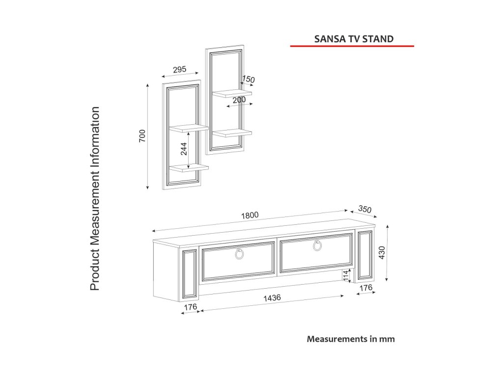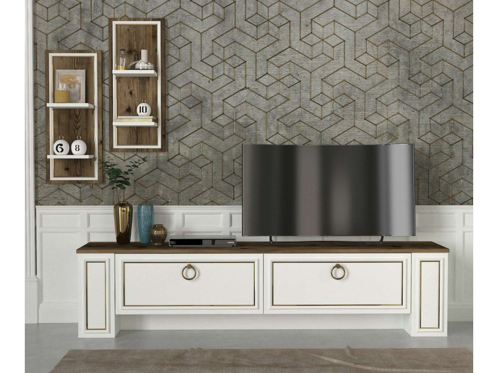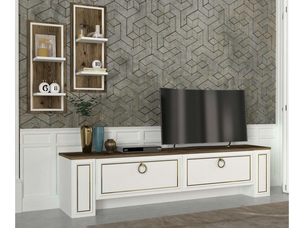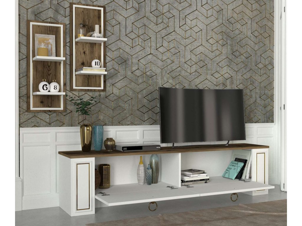 - Rozmery: Zostava zahŕňa TV stolík (180 x 35 x 43 cm) a nástennú policu (30 x 15 x 70 cm), čo poskytuje dostatok priestoru na usporiadanie vašej elektroniky a dekorácií.