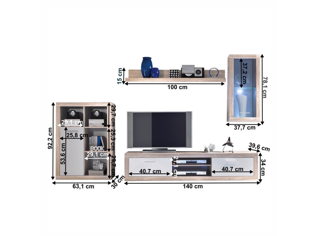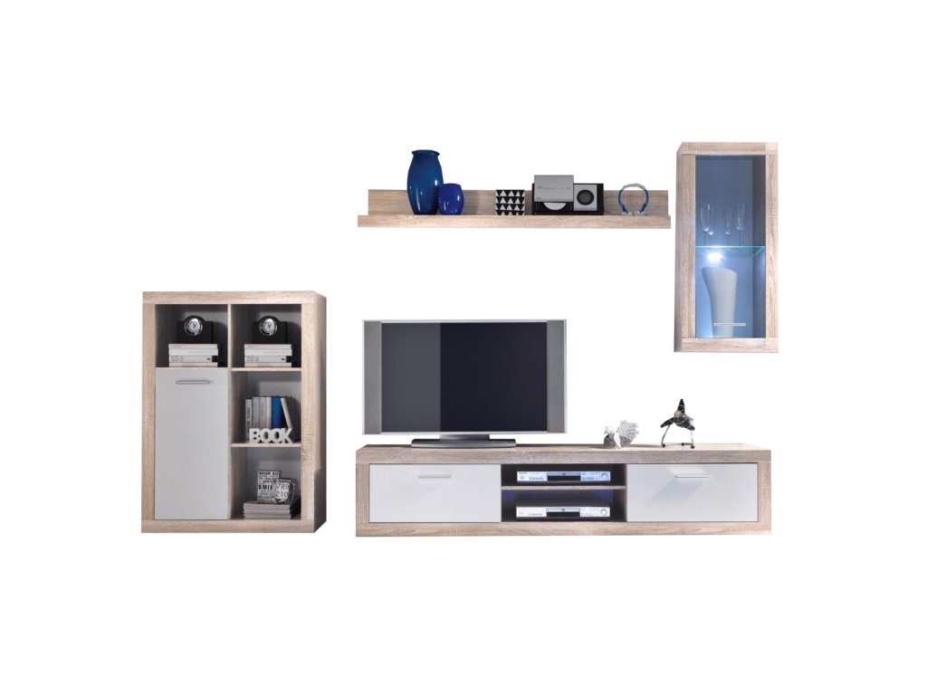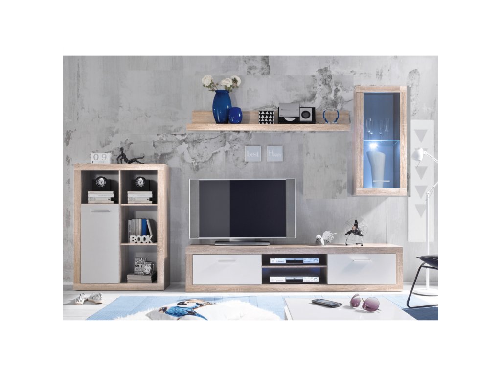 Obývacia stena BARČA bude ozdobou Vašej obývačky a skvelo zapadne do interiéru ladeného v akomkoľvek štýle. Vyrobená je z laminovanej drevotriesky LTD vo farebnej kombinácií dub Sonoma a biela matná. Obývacia stena poskytuje dostatok úložného priestoru a skladá sa z TV stolíka, závesnej vitríny, stojacej skrinky a závesnej police na vystavenie dekorácií.