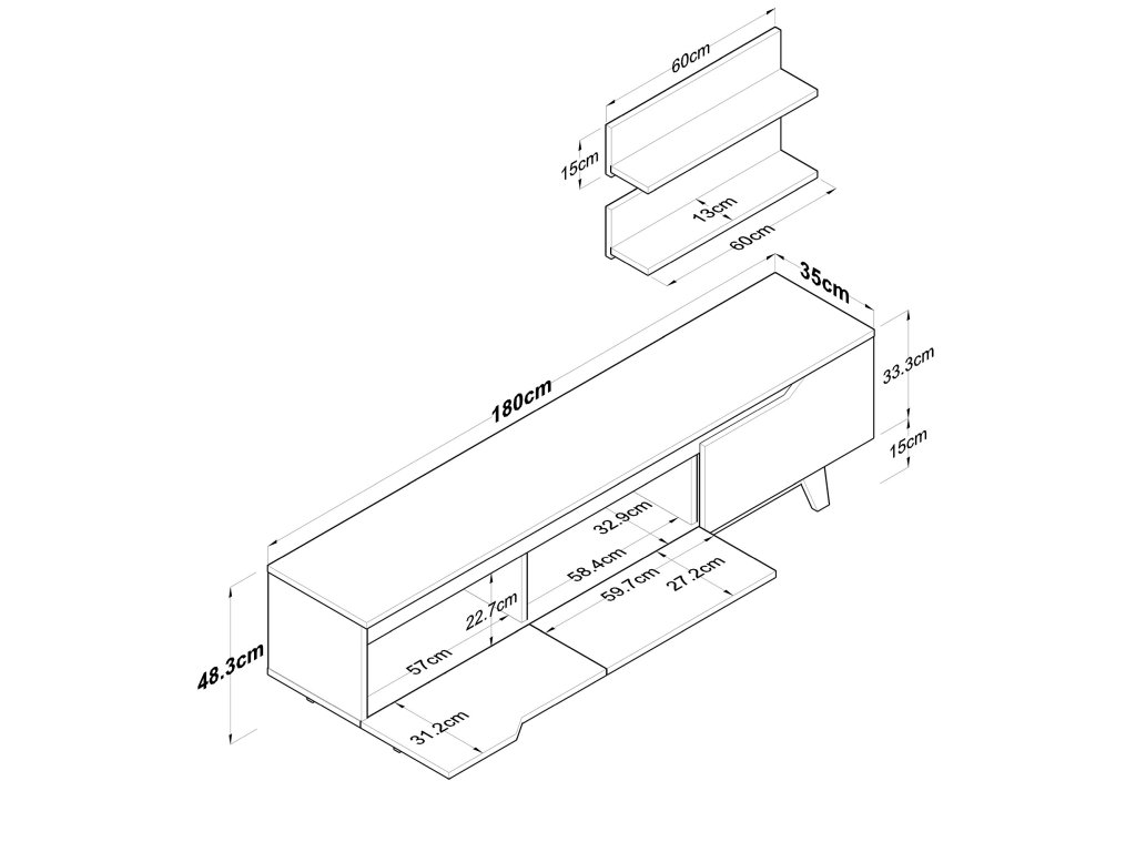 | Zostava obsahuje: | TV stolík 180x35x48, 6cm, 2x nástenná polica 60x15x15cm |