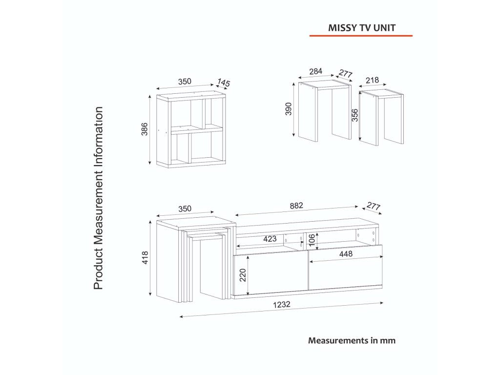 - Dodatočné informácie: Odkladacie stolíky sú vsunuté dovnútra TV stolíka, čo umožňuje efektívne využitie priestoru. Produkt je dodávaný v demontovanom stave, čo uľahčuje transport a montáž.