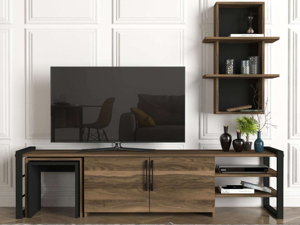 - Rozmery: Hlavný TV stolík má rozmery 180 x 39 x 46 cm, doplnený o nástennú policu (35 x 20 x 82 cm) a dva odkladacie stolíky (39 x 31 x 41 cm), ktoré sú vsunuté dovnútra TV stolíku pre elegantné.