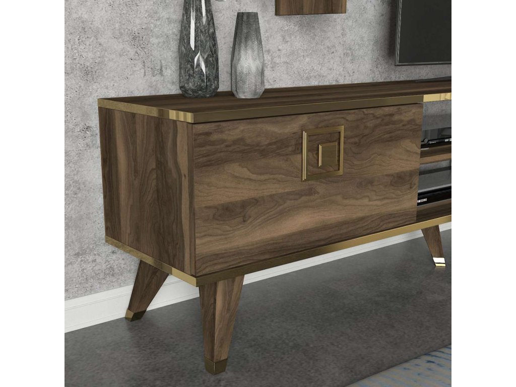 Predstavujeme GLASS, obývaciu stenu, ktorá prináša do vašej obývačky eleganciu a moderný dizajn. Táto štýlová zostava v orechovej farbe je navrhnutá tak, aby poskytovala praktické a estetické riešenie pre vaše multimediálne zariadenia a ďalšie potreby.