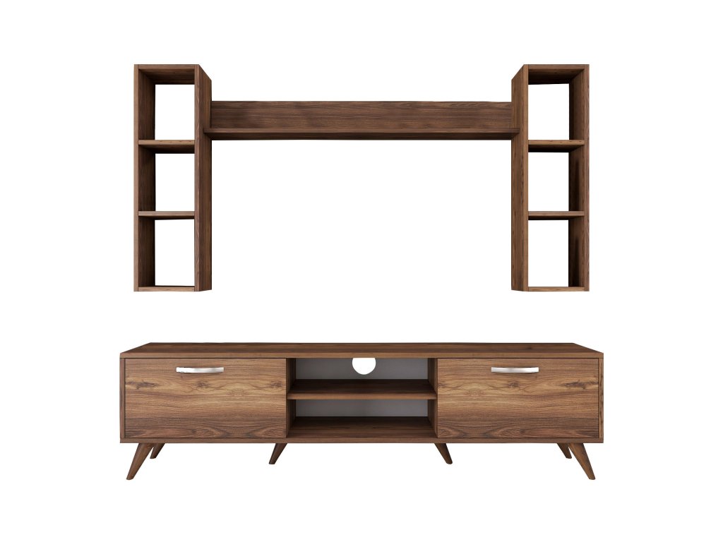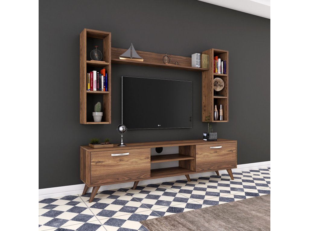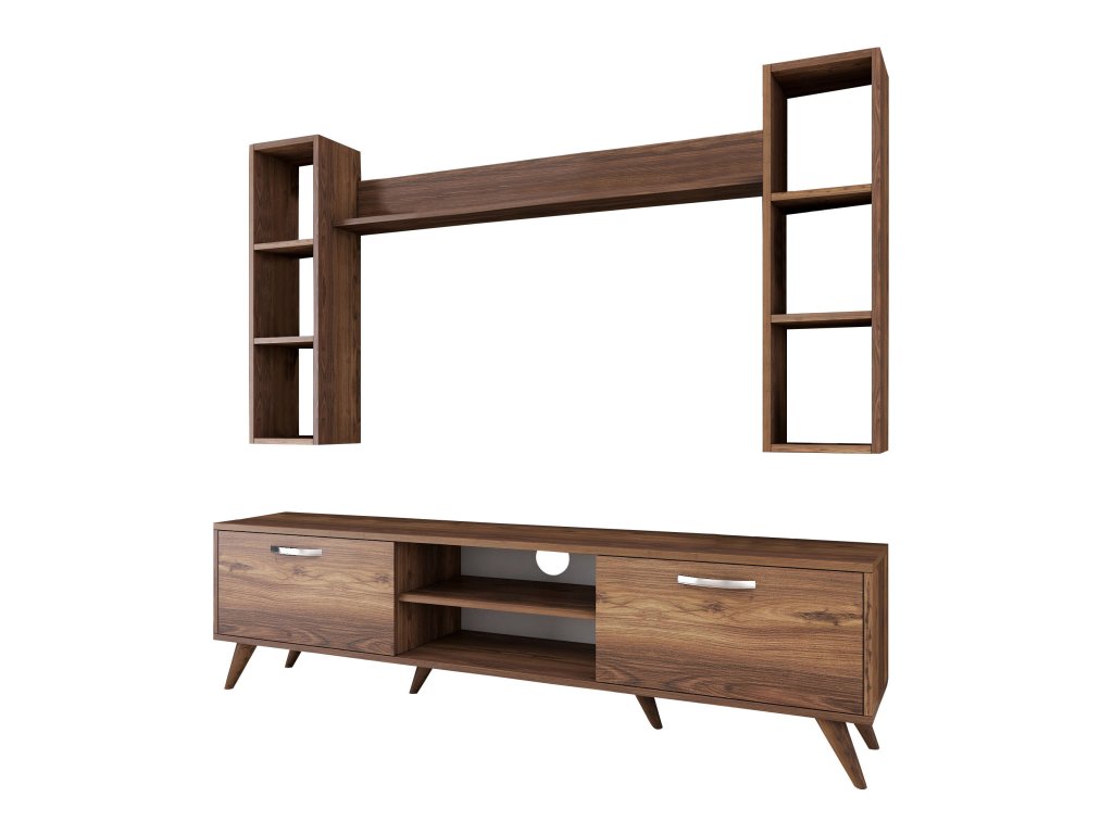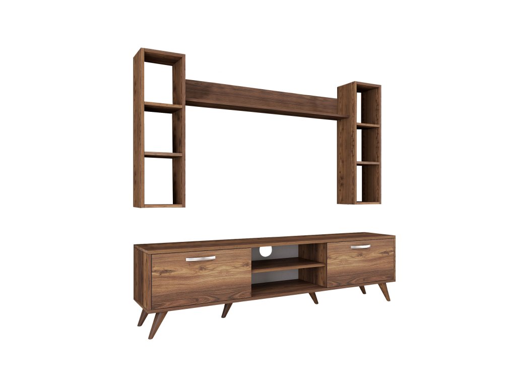 Obývacia stena KISS je dokonalým riešením pre modernú a praktickú obývaciu izbu. Jej elegantný dizajn v dekore orecha prináša do interiéru útulnosť a sofistikovanosť. Vďaka šikovnému usporiadaniu poskytuje dostatok priestoru pre multimediálne zariadenia, knihy a dekorácie.