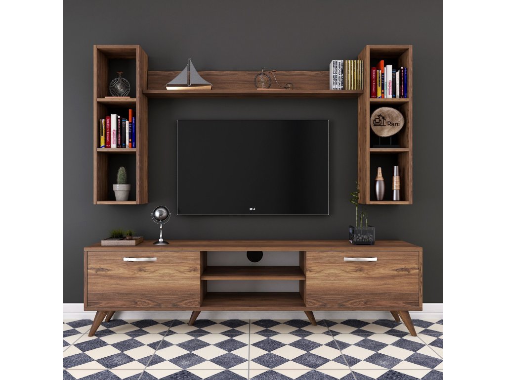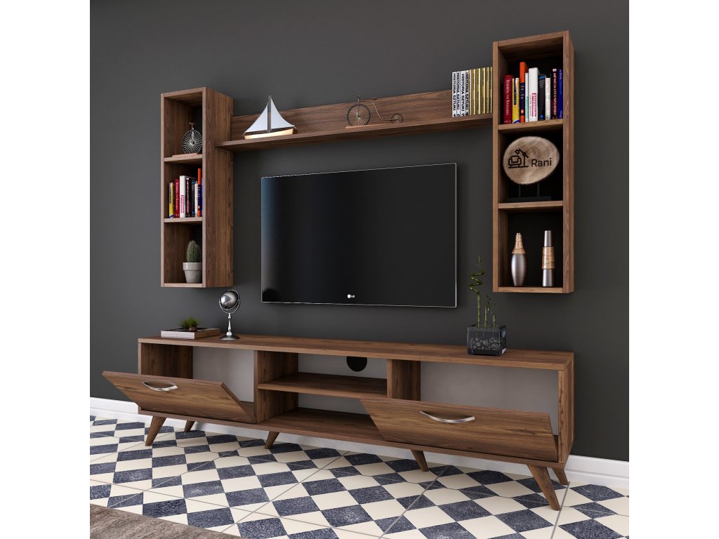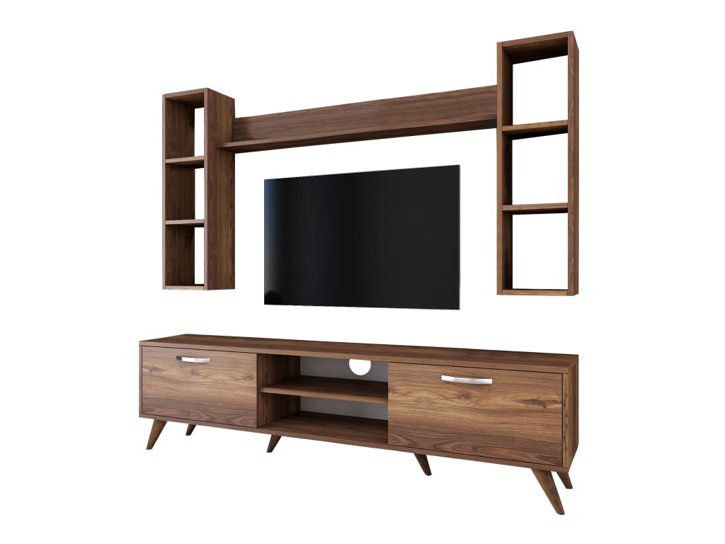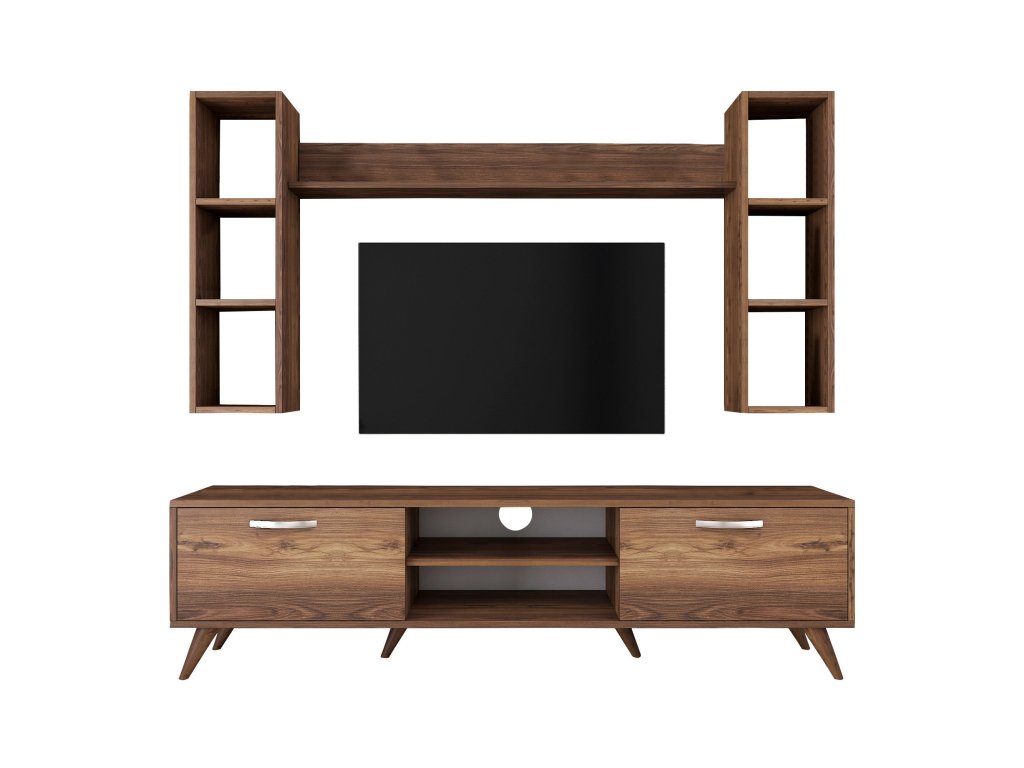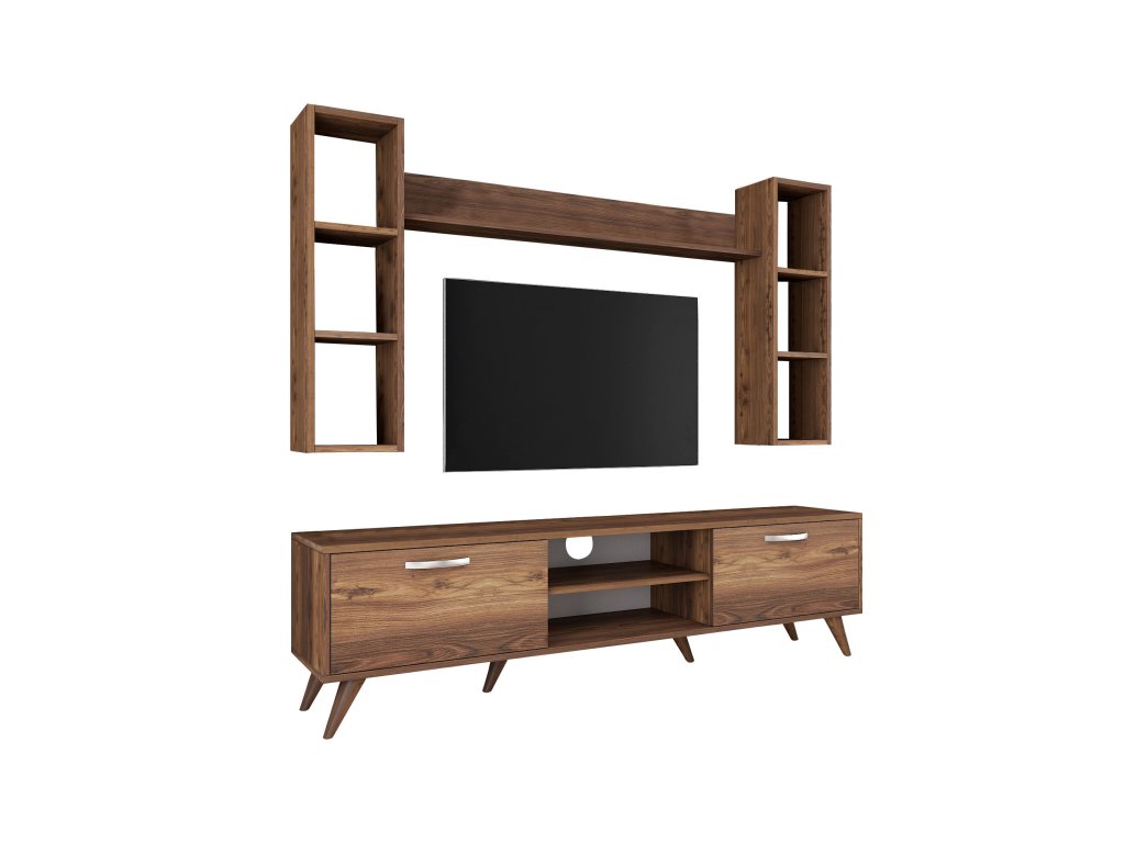 Obývacia stena KISS je dokonalým riešením pre modernú a praktickú obývaciu izbu. Jej elegantný dizajn v dekore orecha prináša do interiéru útulnosť a sofistikovanosť. Vďaka šikovnému usporiadaniu poskytuje dostatok priestoru pre multimediálne zariadenia, knihy a dekorácie.