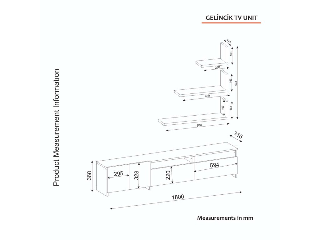 | Zostava obsahuje: | TV stolík š180Xh31,6Xv36,8, 3x závesná polička š60,45,25Xh14,5X16,3 |
