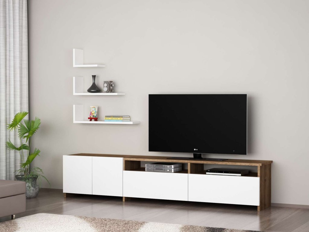 - Vybavenie: Regálka poskytujúca dostatok úložného priestoru pre elektroniku, knihy alebo dekorácie.