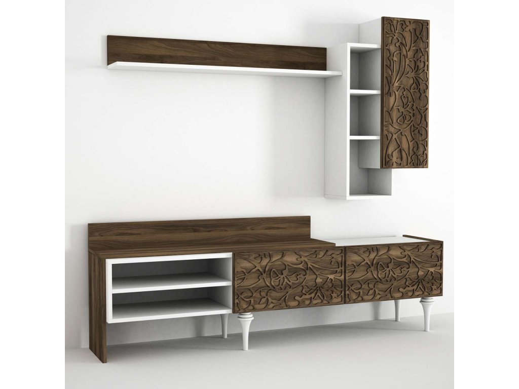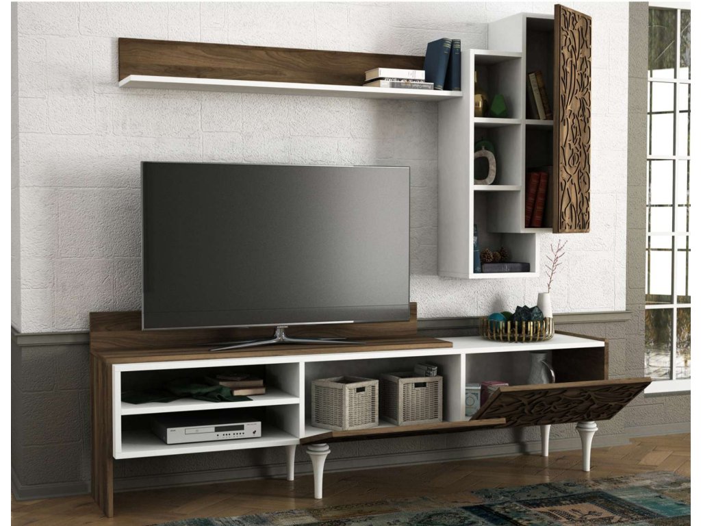 Predstavujeme LENTIRN, obývaciu stenu, ktorá prináša do vašej obývačky luxusný a moderný dizajn. Táto štýlová zostava v kombinácii bielej a orechovej farby je navrhnutá tak, aby poskytovala praktické a estetické riešenie pre vaše multimediálne zariadenia a ďalšie potreby.