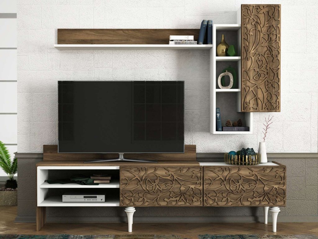 - Vybavenie: Regálka poskytujúca dostatok úložného priestoru pre elektroniku, knihy alebo dekorácie.