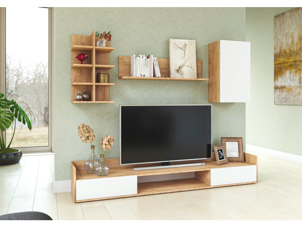 | Zostava obsahuje: | TV stolík (š/v/h): 200 x 30 x 40 cm, závesná skrinka (š/v/h): 40 x 70 x 28 cm, polička (š/v/h): 100 x 20 x 19,6 cm, regál (š/v/h). 40 x 70 x 28 cm |