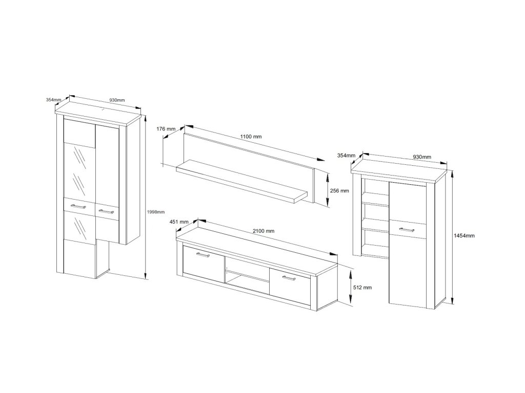| Zostava obsahuje: | Vysoká skrinka (199x93x35) TV stolík (51x210x45) závesná polica, (25x110x17) nízka skrinka (145x93x35) Komplet 315 x 200 x 45 cm. |