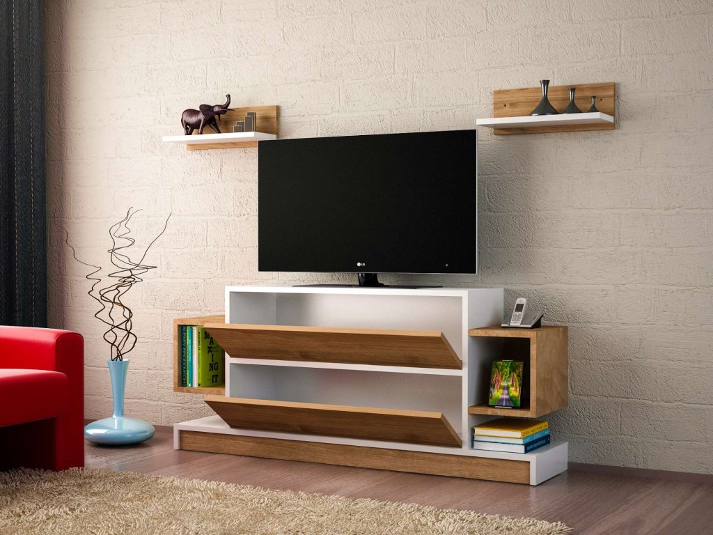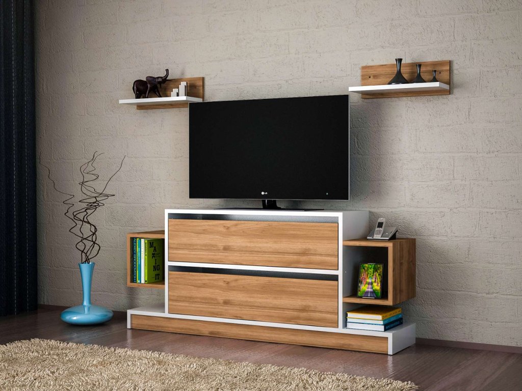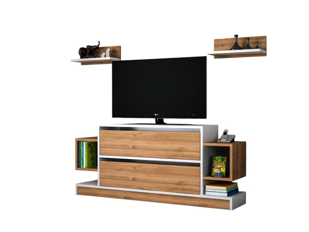 - Vybavenie: Regálka poskytujúca dostatok úložného priestoru pre elektroniku, knihy alebo dekorácie.