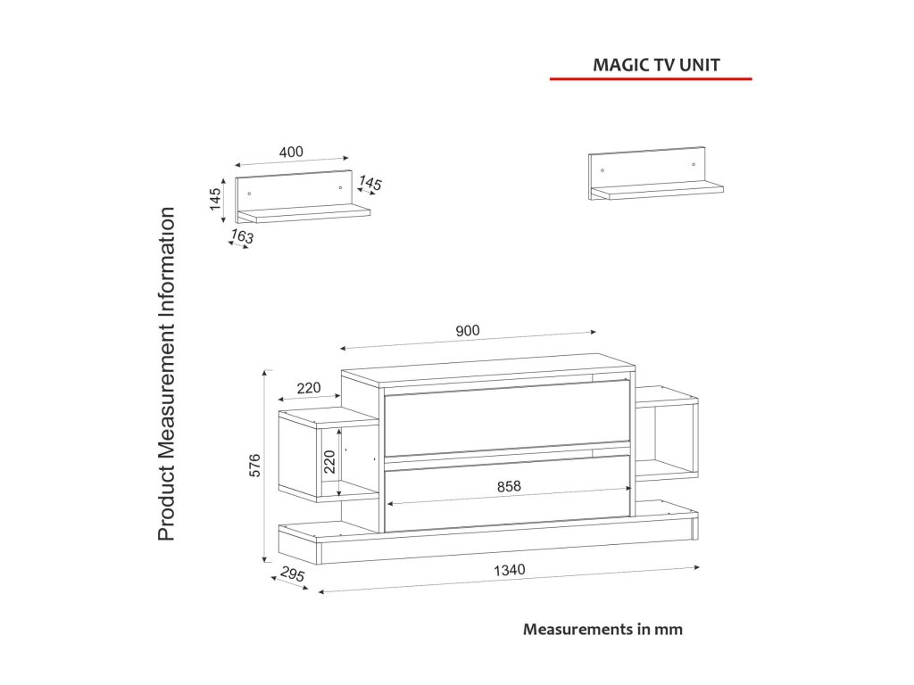 - TV stolík: 134 x 29.5 x 57.5 cm