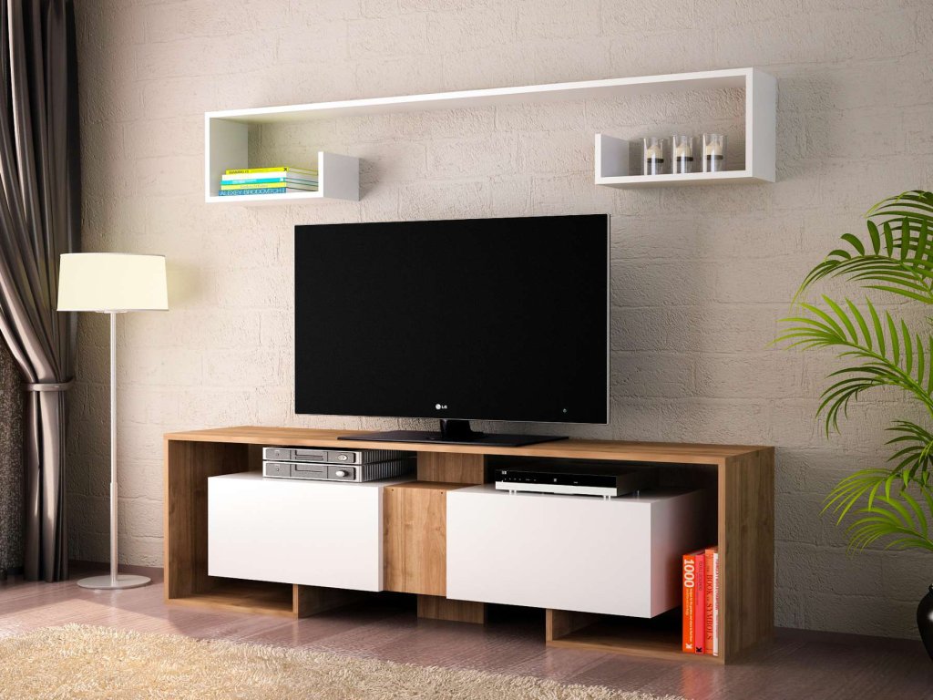 - Vybavenie: Regálka poskytujúca dostatok úložného priestoru pre elektroniku, knihy alebo dekorácie.