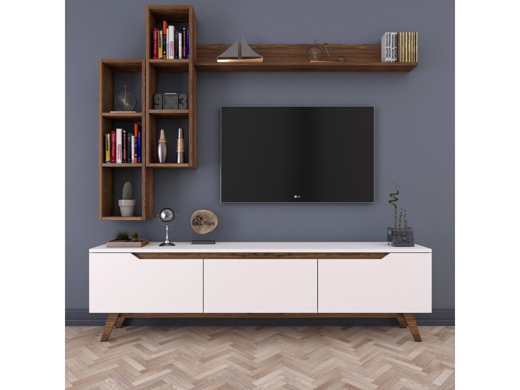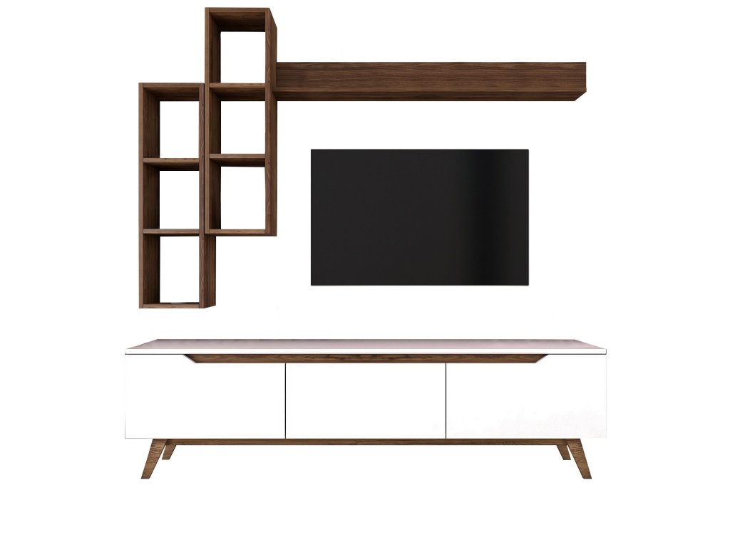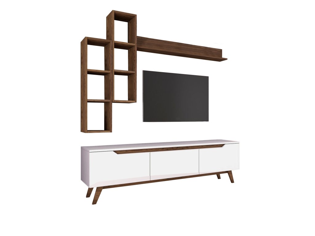 Obývacia stena WHITE kombinuje elegantný štýl s praktickým usporiadaním, čím sa stáva ideálnym riešením pre vašu obývaciu izbu. Moderné prevedenie v kombinácii bielej farby a dekoru orecha prináša do vášho interiéru harmóniu a sofistikovaný vzhľad.
