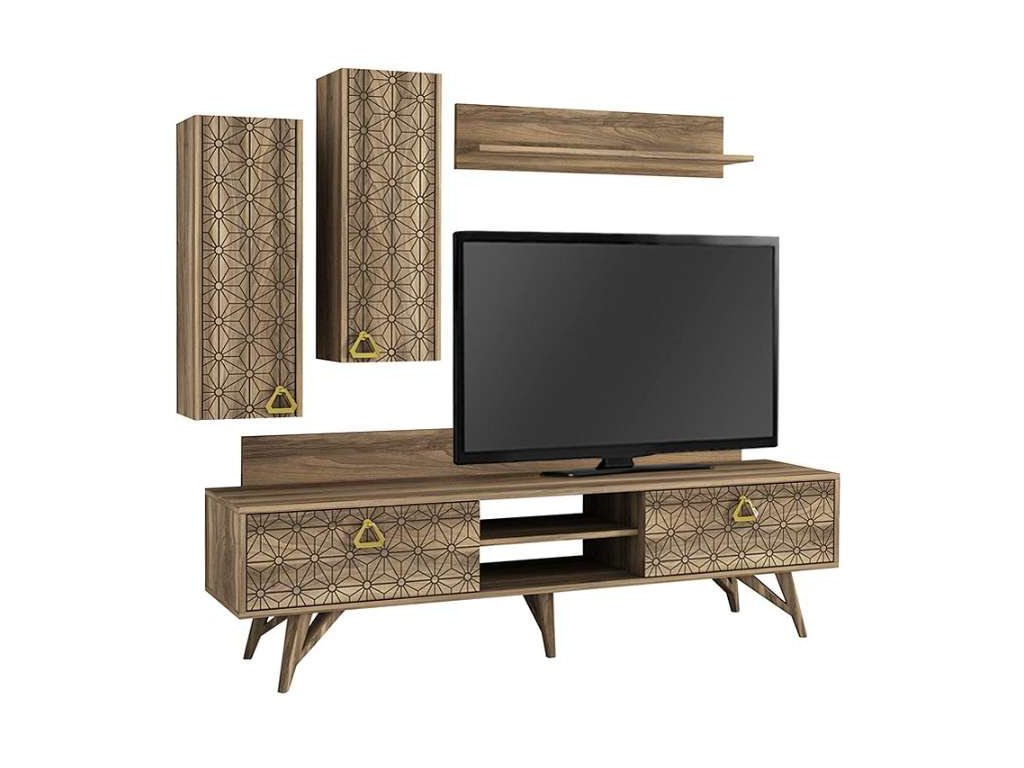- Rozmery: TV stolík (180 x 30 x 48.6 cm), nástenná polica (90 x 15 x 20 cm) a dve nástenné skrinky (každá 29 x 20 x 80 cm), poskytujúca dostatočný úložný priestor pre vašu elektro.