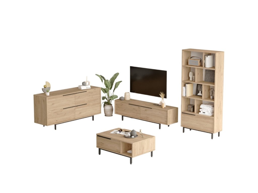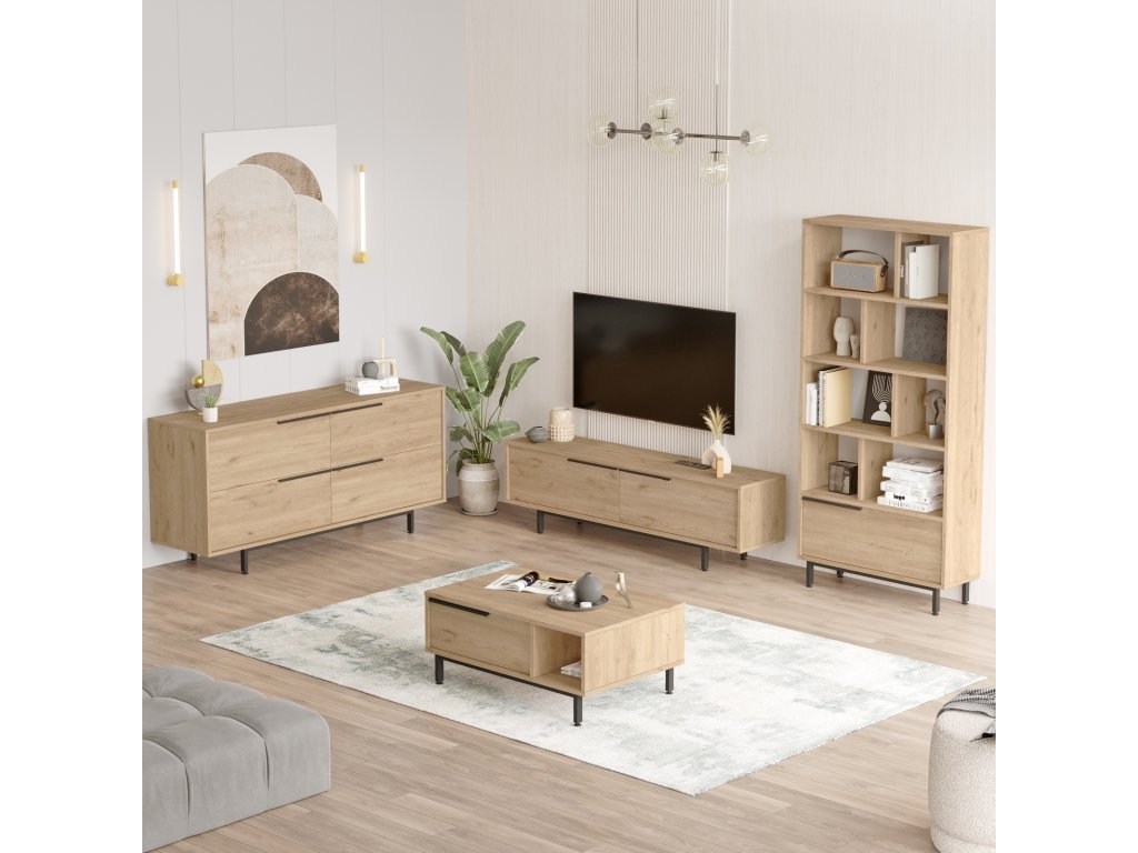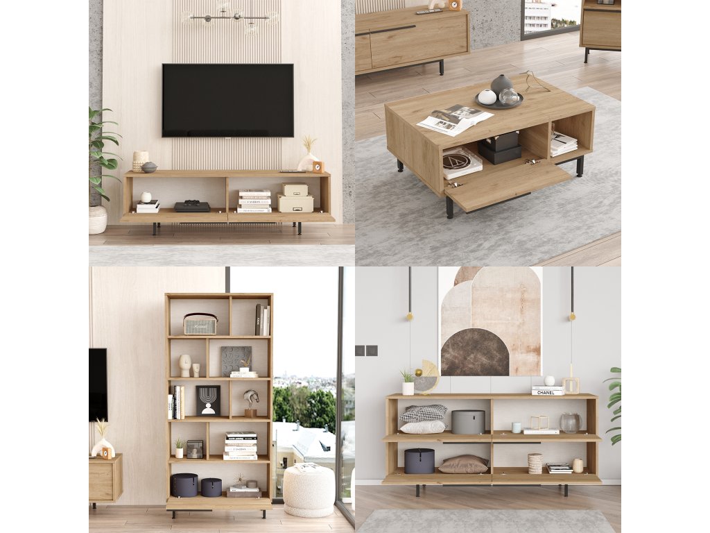 | Zostava obsahuje: | televízny stolík 160x35,5x45,1cm, konferenčný stolík 90x60x37,6cm, komoda 160x44,5x74,3cm, knižnica 83,9x29,5x175,6cm |