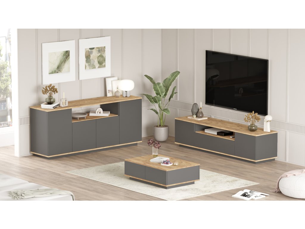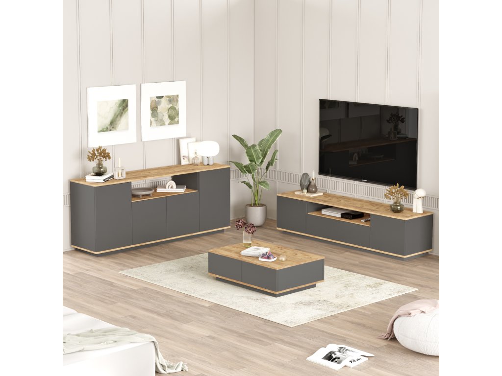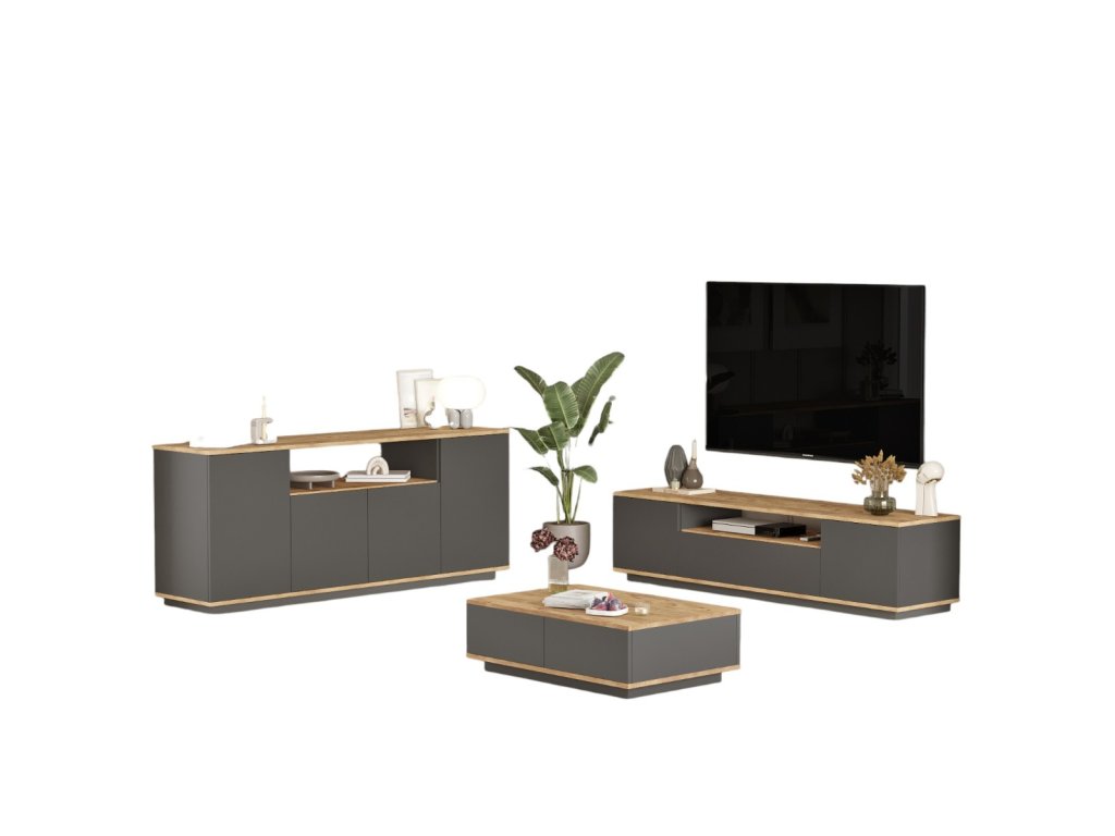 Zostava obsahuje TV stolík, konferenčný stolík a priestrannú komodu.