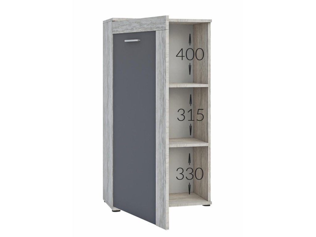 Tento cenovo dostupný nábytok je vyrobený z kvalitnej lamino dosky, ktorá nie je náročná na údržbu. Prepojenie dvoch farieb vytvára unikátny dizajnový celok. Korups nábytku je vo farbe dub artwood, dvierka sú v prevedení grafit.