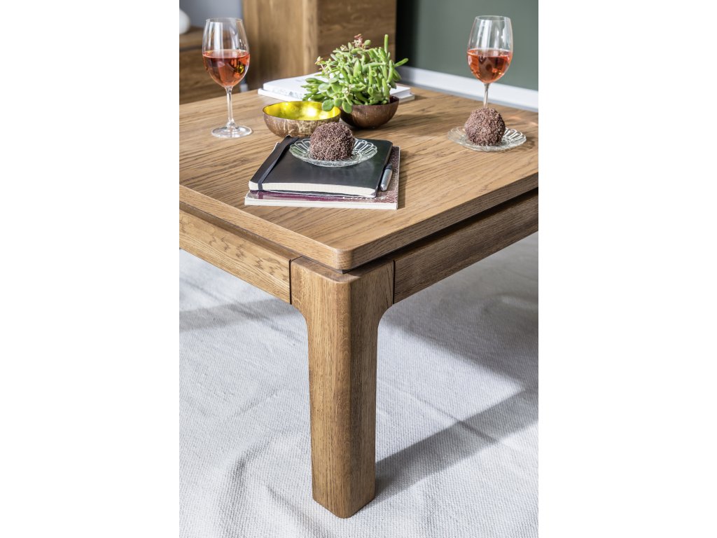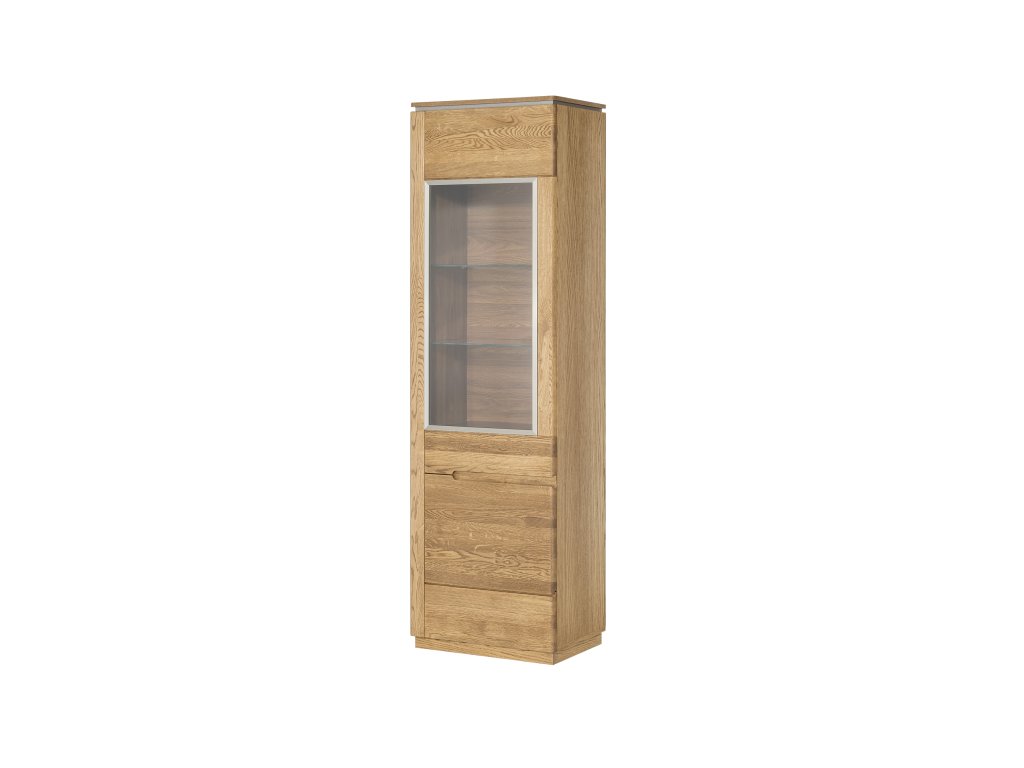 Dvierka nábytku sú vyrobené z pravého masívneho dreva. Sklo vo vitrínach je ohraničené matným hlinikovým rámom. Zadná časť nábytku je vyrobená z prírodnej dubovej dýhy, vnútro je štandardne vyrobené z kvalitnej LTD dosky, ktorá je potiahnutá odolnou fóliou. Povrch nábytku je natretý ochranným ekologickým lakom.
