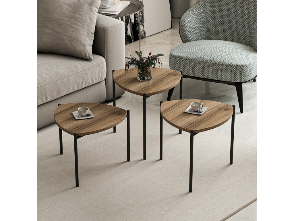 Sada obsahuje tri vkladacie stolíky rôznych veľkostí, ktoré vám umožnia usporiadať ich do rôznych konfigurácií podľa vašich potrieb. Keď sa nepoužívajú, menšie stolíky sa úhľadne zmestia pod väčšie, čím sa ušetrí cenný priestor na podlahe. Tento všestranný dizajn je ideálny pre malé byty alebo miestnosti s obmedzeným priestorom.