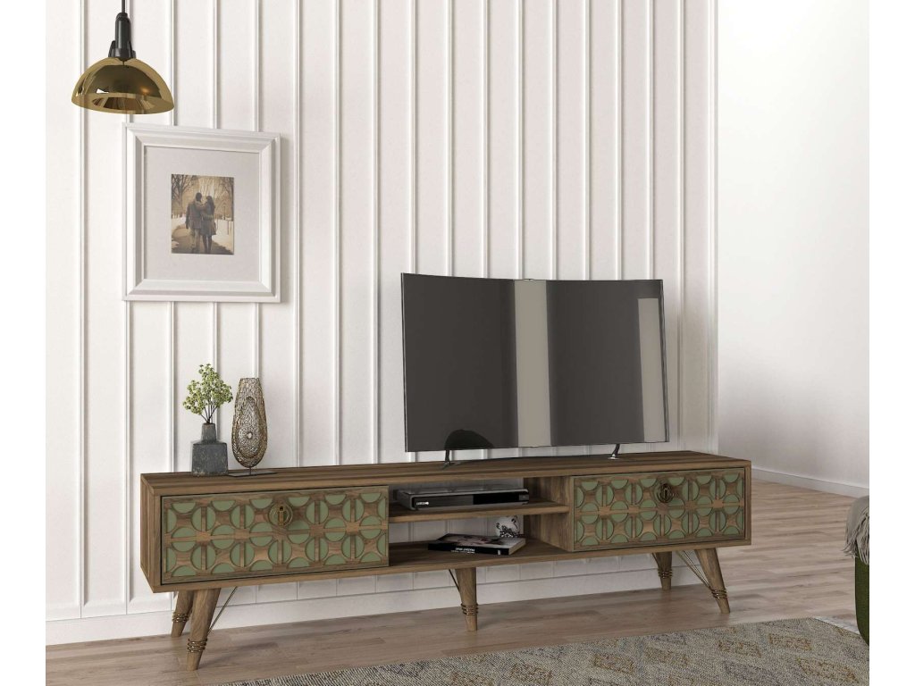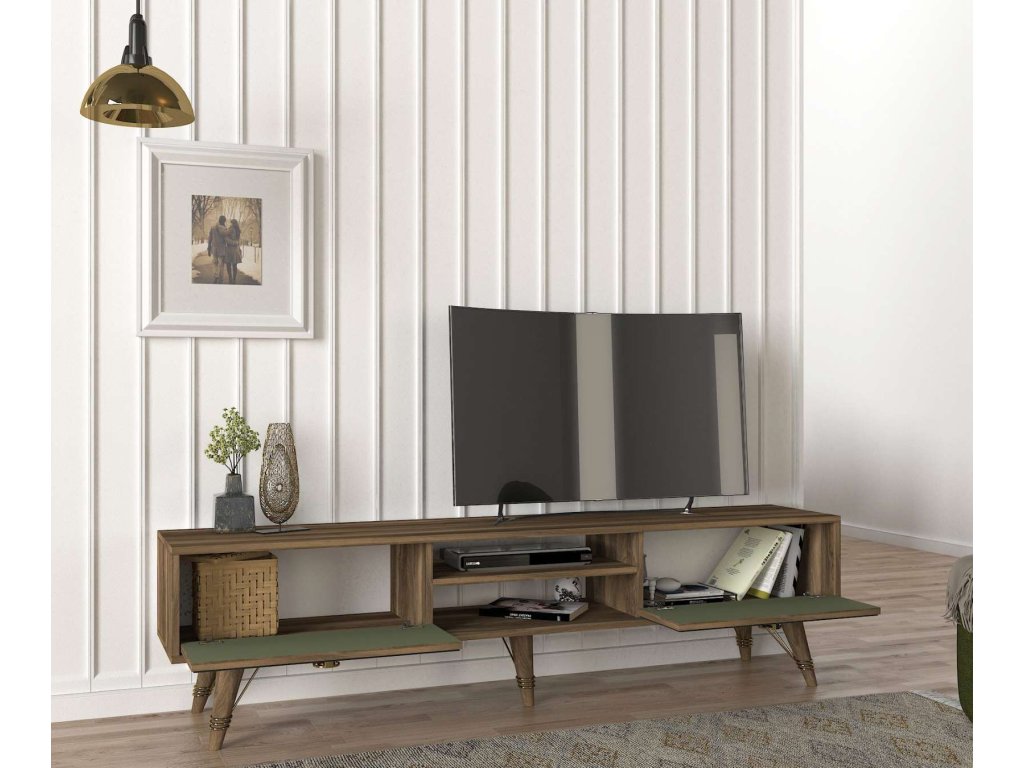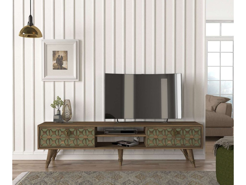 Predstavujeme VIOLE, TV stolík, ktorý skvele kombinuje funkčnosť a orientálny dizajn. Tento kus nábytku s orechovým a zeleným prevedením prináša do vašej obývačky teplý a prívetivý vzhľad s nádychom exotiky.