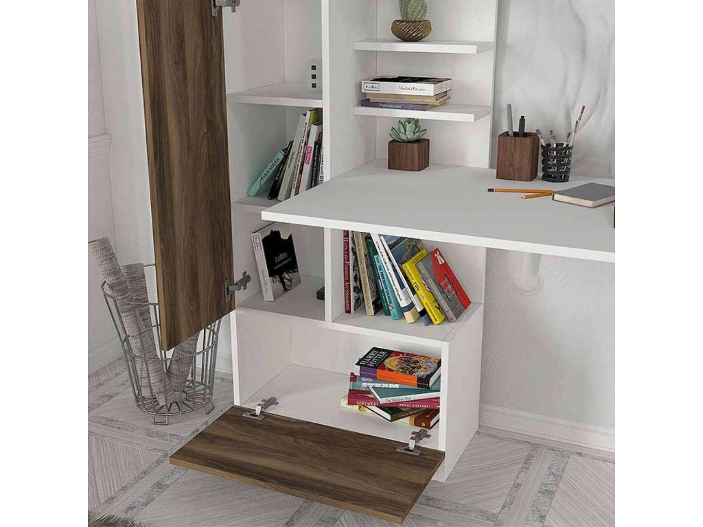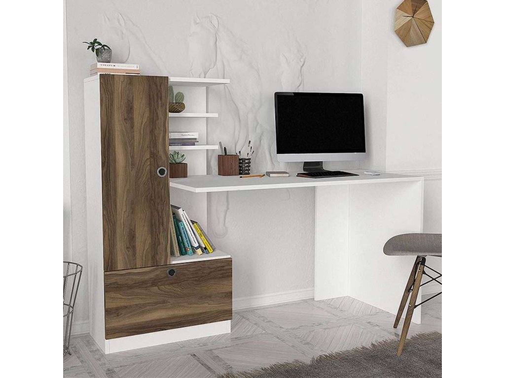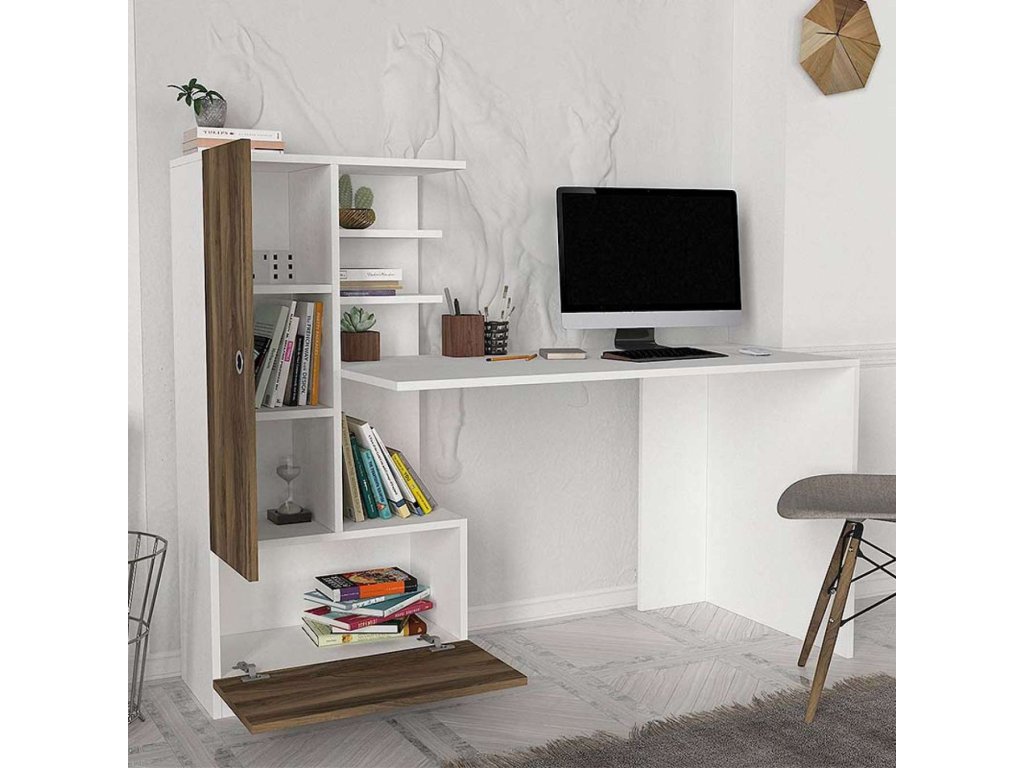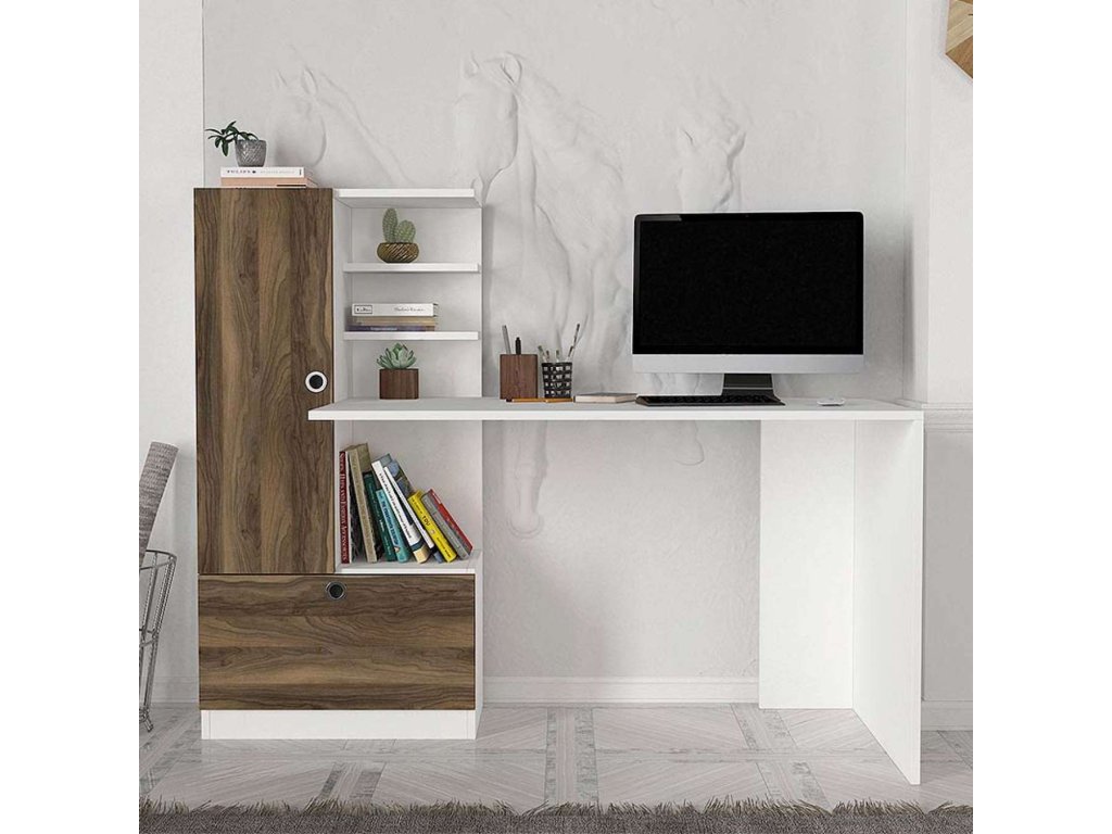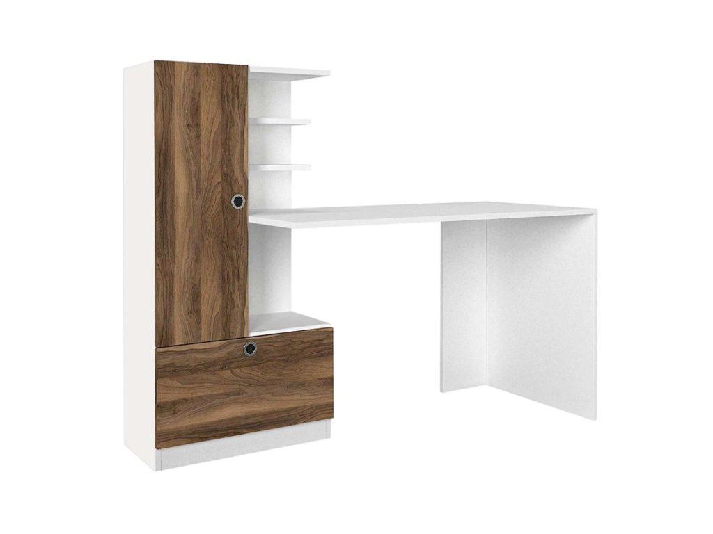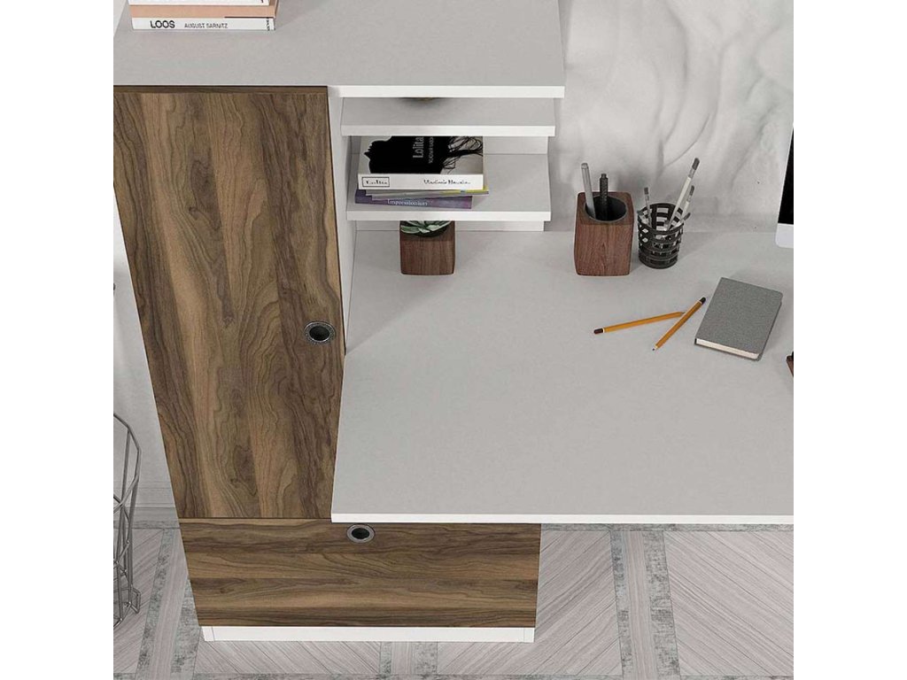Písací stôl DOMINO je vyrobený z kvalitného materiálu LTD s hrúbkou 18 mm, čo zaručuje jeho dlhú životnosť a stabilitu. Elegantná kombinácia bielej farby a orecha dodá vašej miestnosti moderný a útulný vzhľad. Súčasťou stola je praktický regál, ktorý poskytuje dostatok úložného priestoru pre vaše pracovné pomôcky.