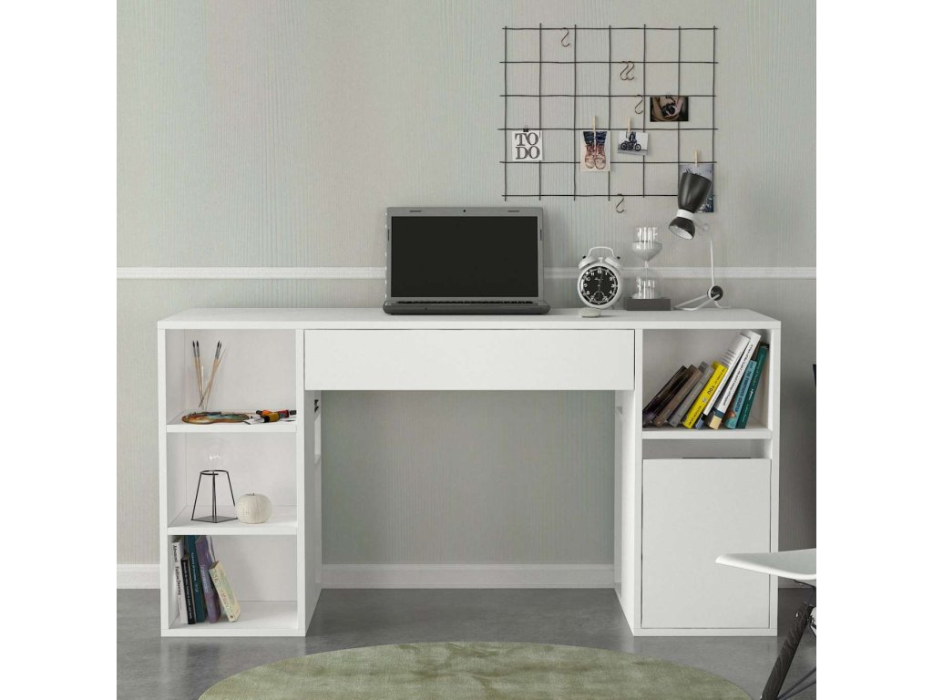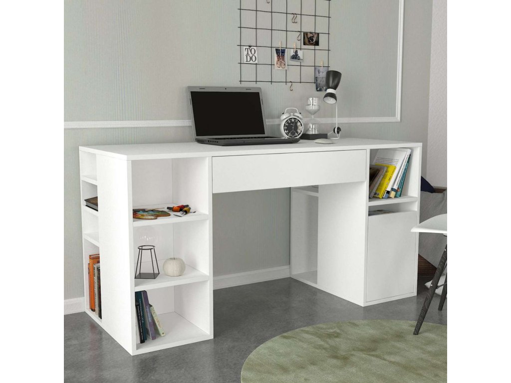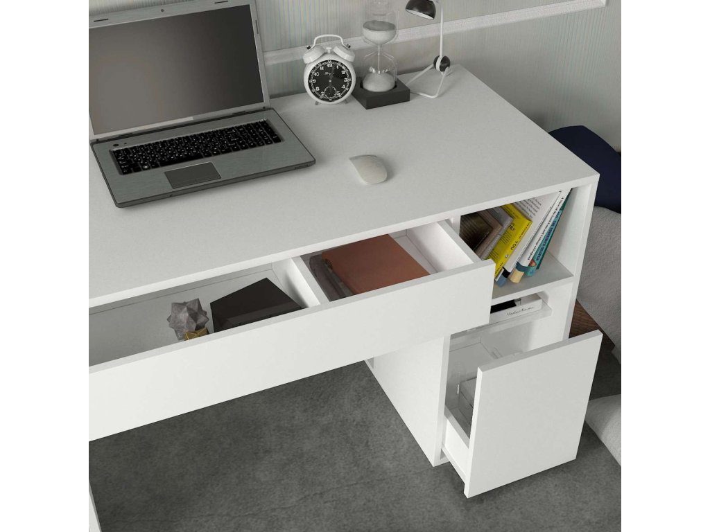 Písací stôl EMERALD je vyrobený z kvalitného LTD materiálu s hrúbkou 18 mm, čo zaisťuje jeho pevnosť a dlhú životnosť. Elegantná biela farba dodáva stolu moderný a čistý vzhľad, ktorý sa hodí do akéhokoľvek interiéru. Stôl je vybavený praktickým regálkom a dvoma zásuvkami, ktoré poskytujú dostatok úložného priestoru pre všetky vaše pracovné potreby a pomôcky.