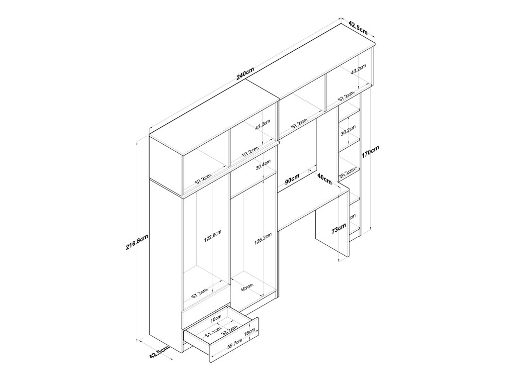 - Rozmery: 216,8 x 240 x 42,5 cm – vysoká a široká konštrukcia pre maximálne využitie priestoru.