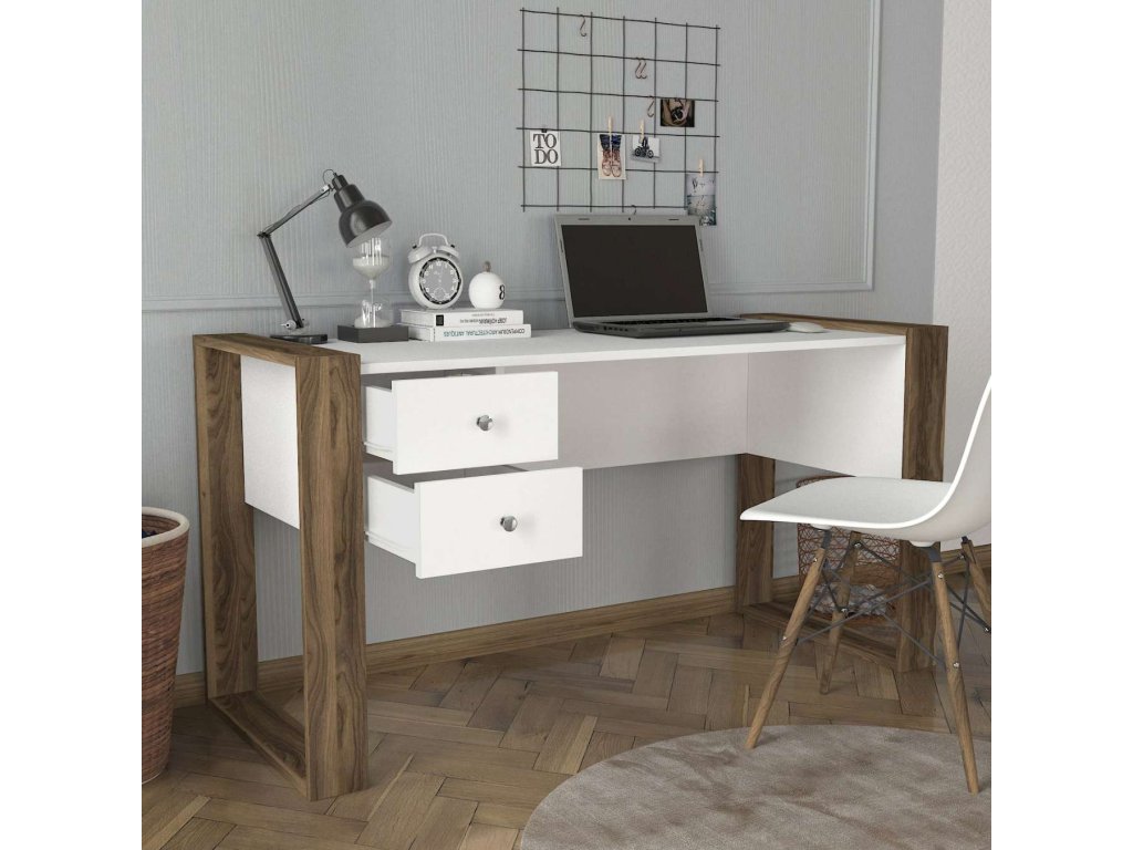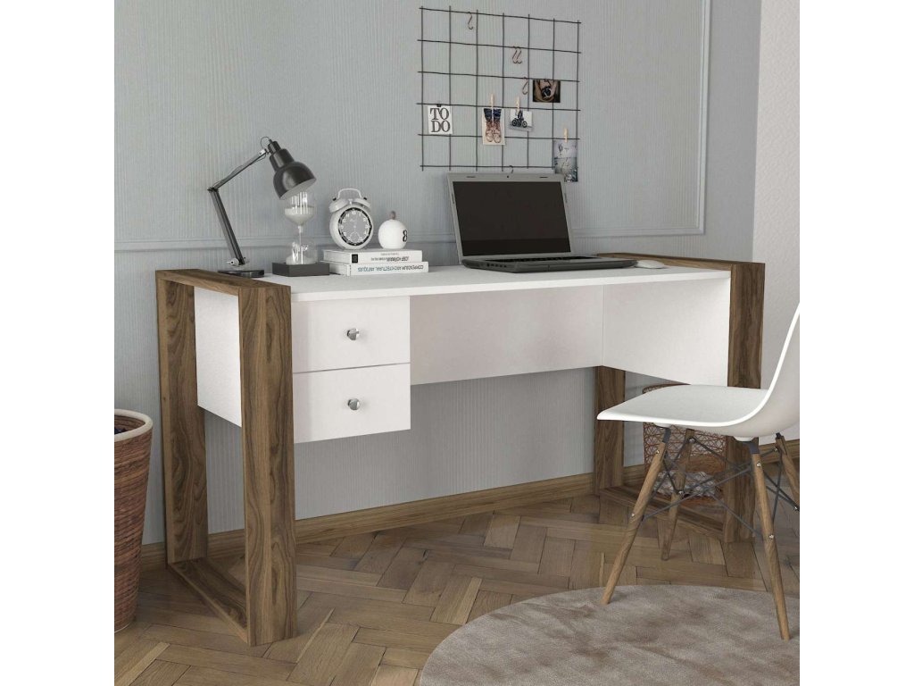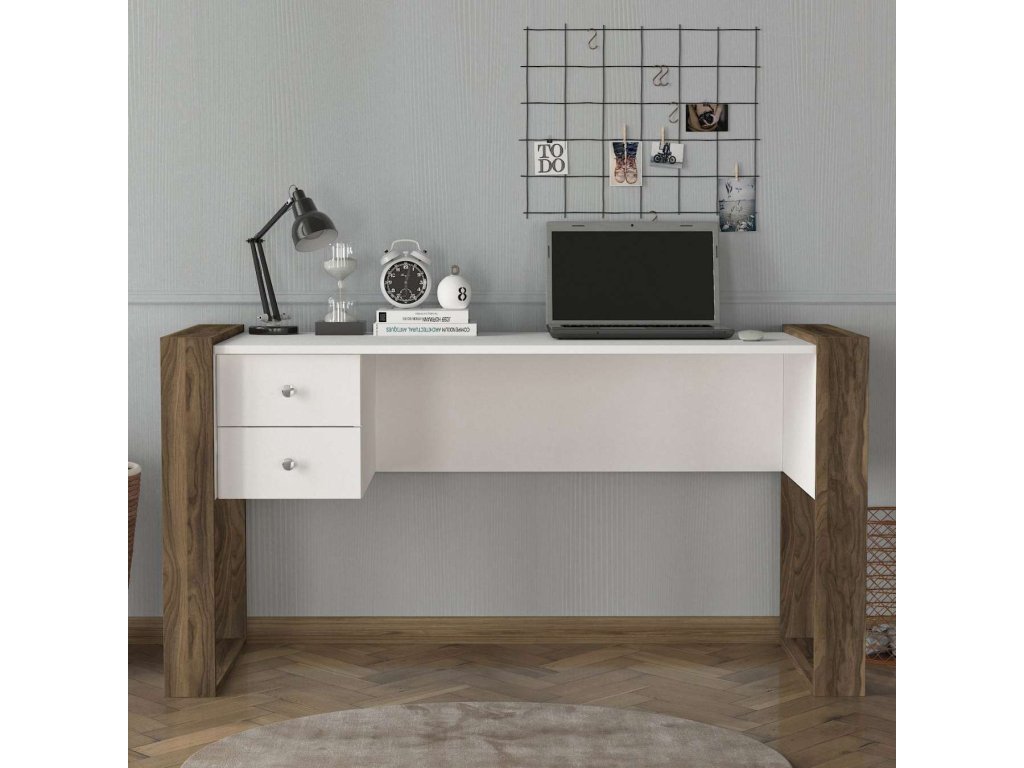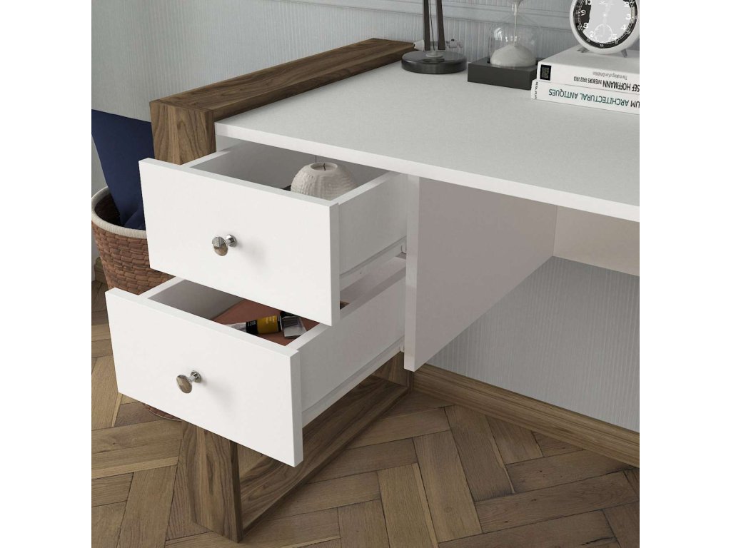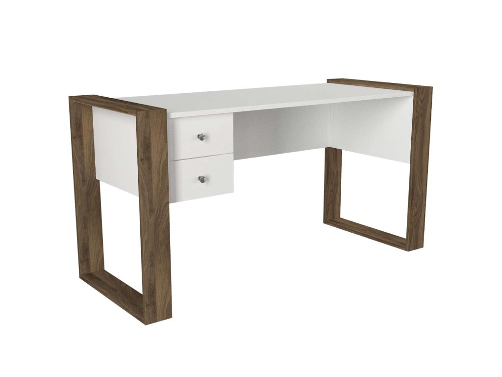 Písací stôl SULTAN je vyrobený z kvalitného LTD materiálu s hrúbkou 18 mm, čo zaisťuje jeho pevnosť a dlhú životnosť. Elegantná kombinácia bielej farby a orechového dekoru dodáva stolu moderný a štýlový vzhľad, ktorý sa hodí do akéhokoľvek interiéru. Stôl je vybavený dvoma praktickými zásuvkami, ktoré poskytujú dostatok úložného priestoru pre vaše pracovné potreby a pomôcky.