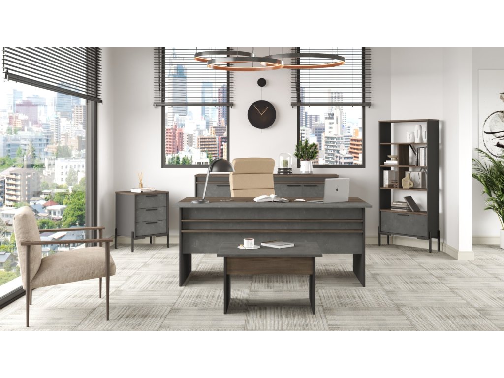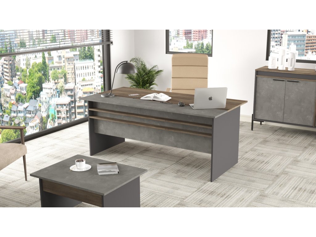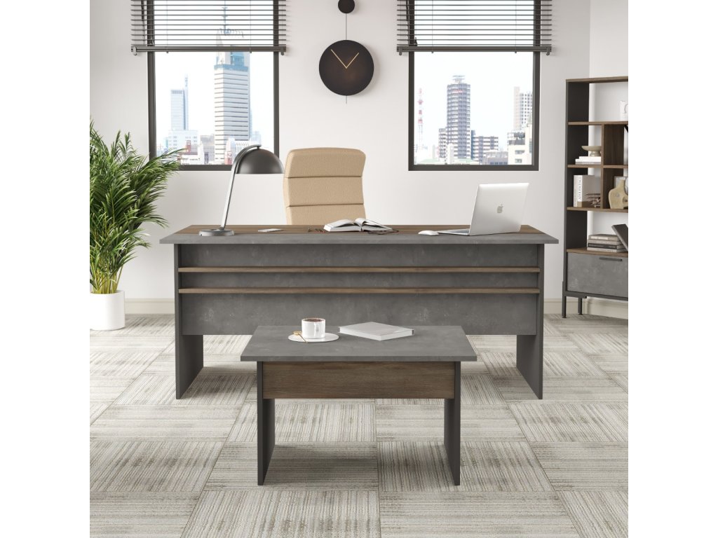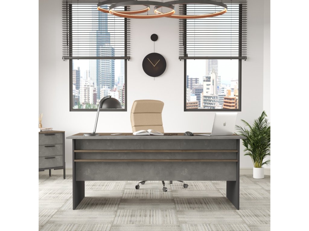 Prinášame vám nový písací stôl VISTA 1, ktorý sa stane centrálnym kúskom každej moderny zariadenej kancelárie alebo pracovne. S jeho impozantnými rozmermi a výrazným dekórom betónu, tento stôl nielenže poskytuje komfort a funkčnosť, ale tiež pridáva silný estetický prvok do vášho pracovného priestoru.