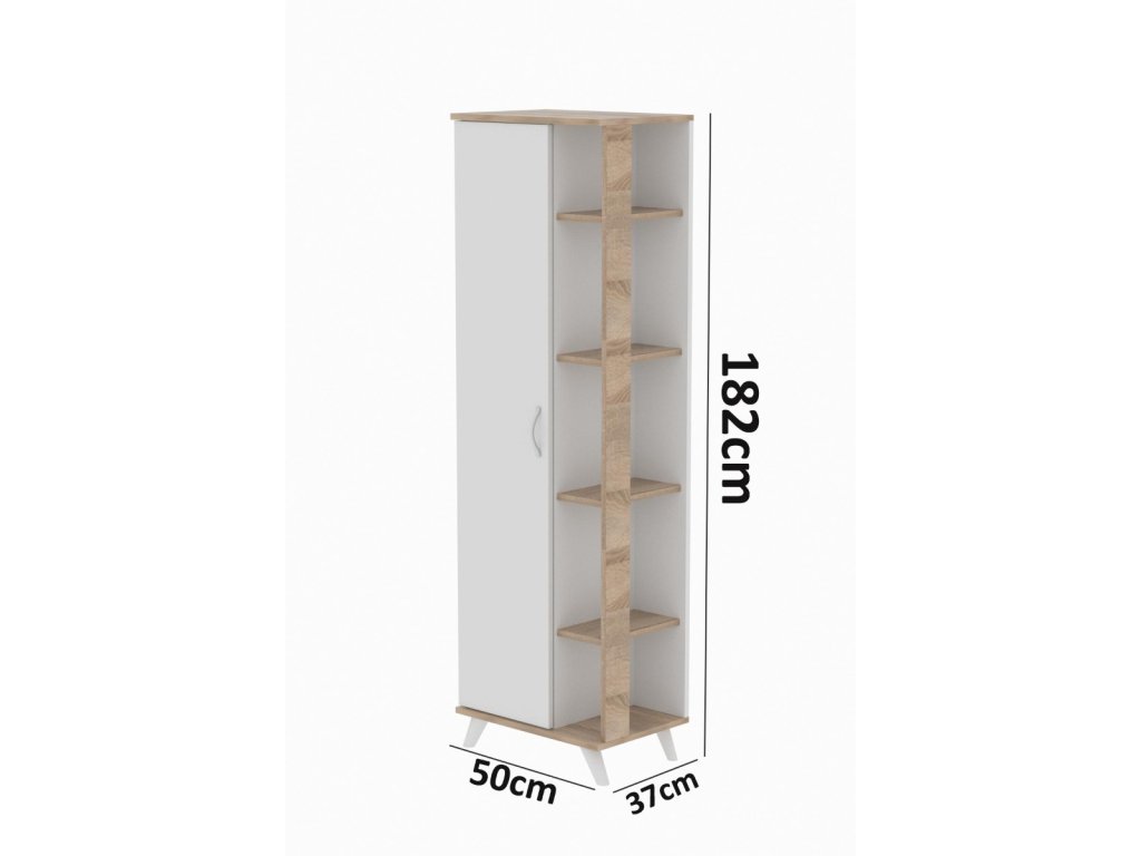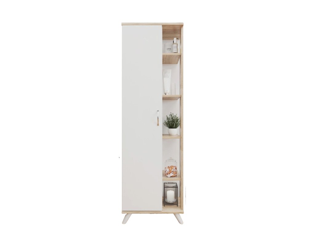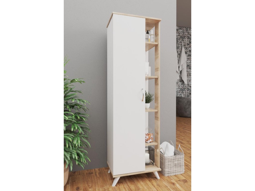 Skriňa MONELO disponuje 1 dverami a 3 priestrannými poličkami vo vnútri a 4 poličkami zvonku, ktoré poskytujú dostatok miesta pre vaše veci. Stojí na elegantných nožičkách, čo uľahčuje údržbu podlahy pod ňou. Vyrobená z kvalitnej drevotriesky potiahnutej melamínom, skriňa MONELO zaisťuje dlhú životnosť a odolnosť.