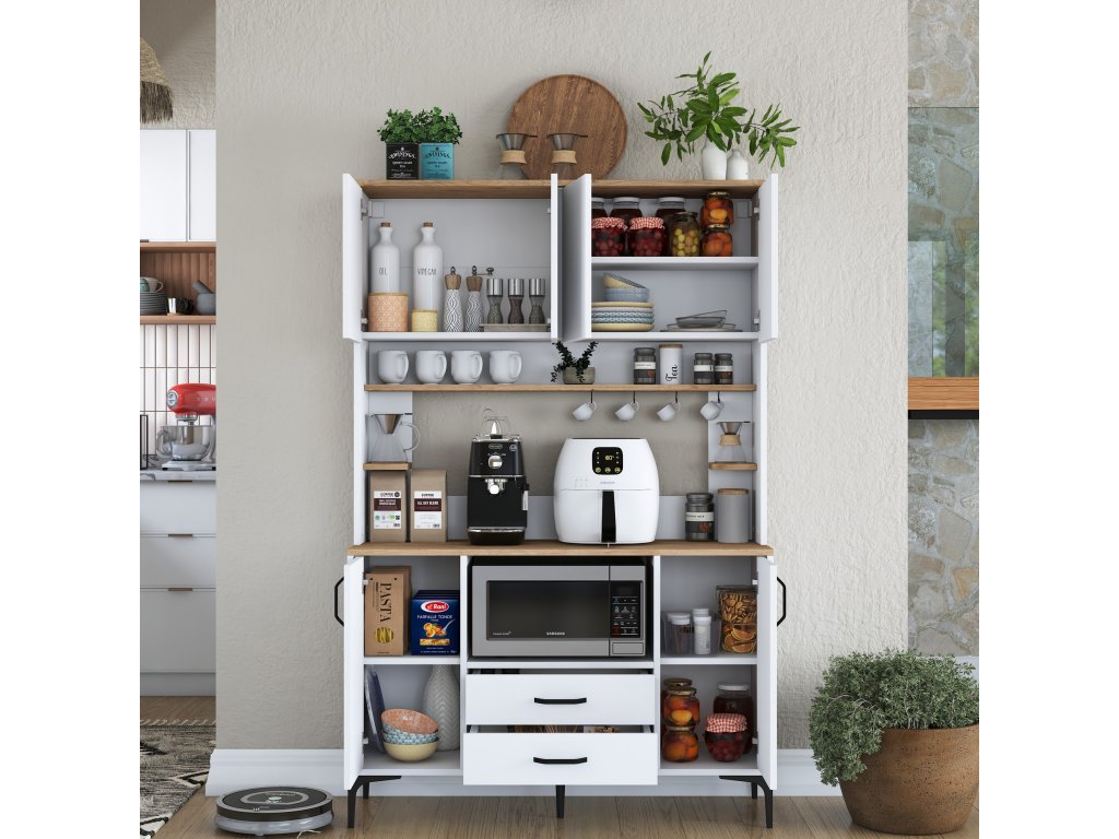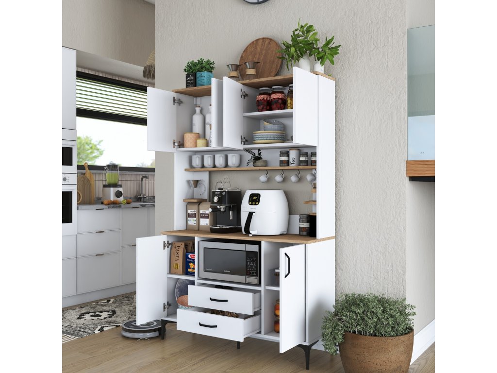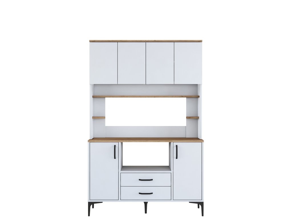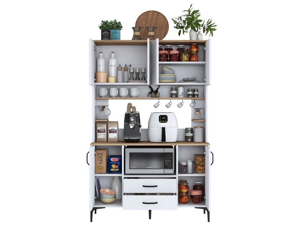 Skriňa DUCK ponúka praktické usporiadanie úložného priestoru vďaka šiestim plným dvierkam, dvom zásuvkám a otvorenému regálku. Tento viacúčelový dizajn zaisťuje pohodlný prístup ku kuchynským potrebám, riadu alebo ďalším predmetom.
