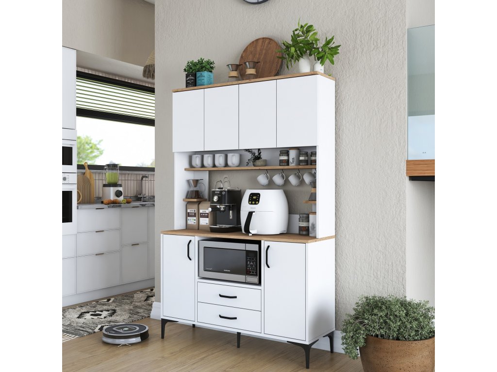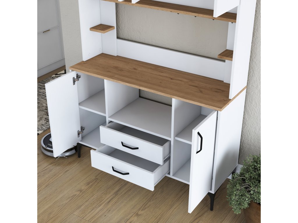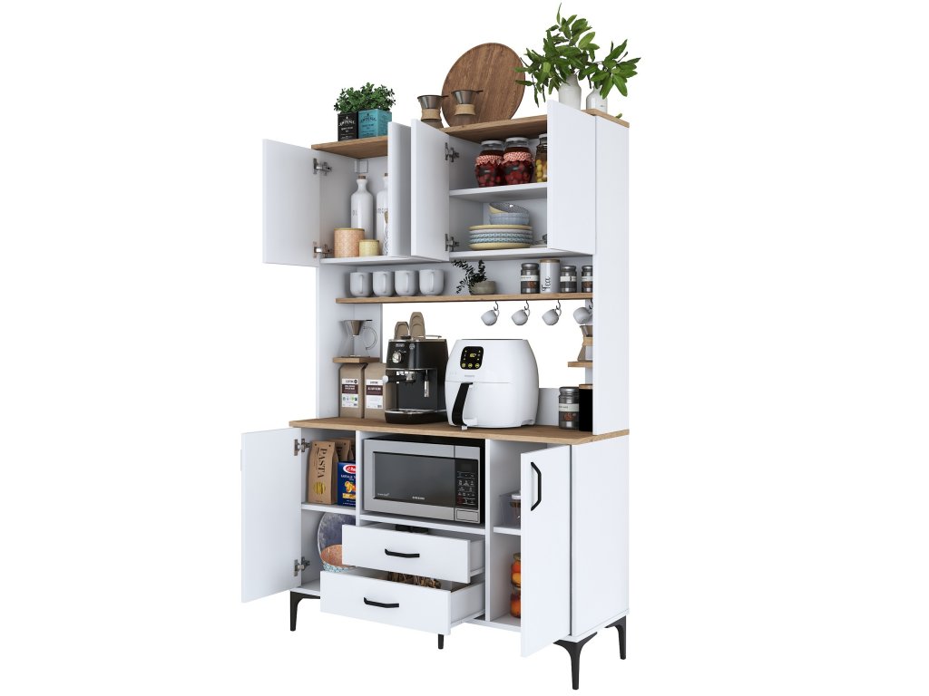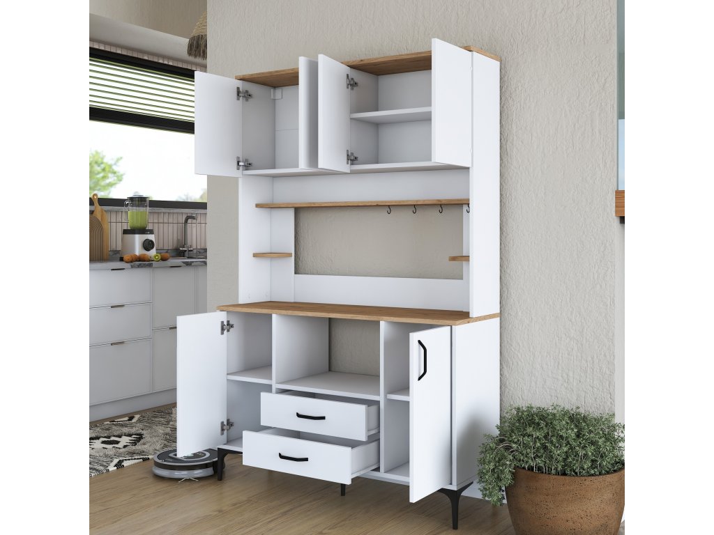 Skriňa DUCK ponúka praktické usporiadanie úložného priestoru vďaka šiestim plným dvierkam, dvom zásuvkám a otvorenému regálku. Tento viacúčelový dizajn zaisťuje pohodlný prístup ku kuchynským potrebám, riadu alebo ďalším predmetom.