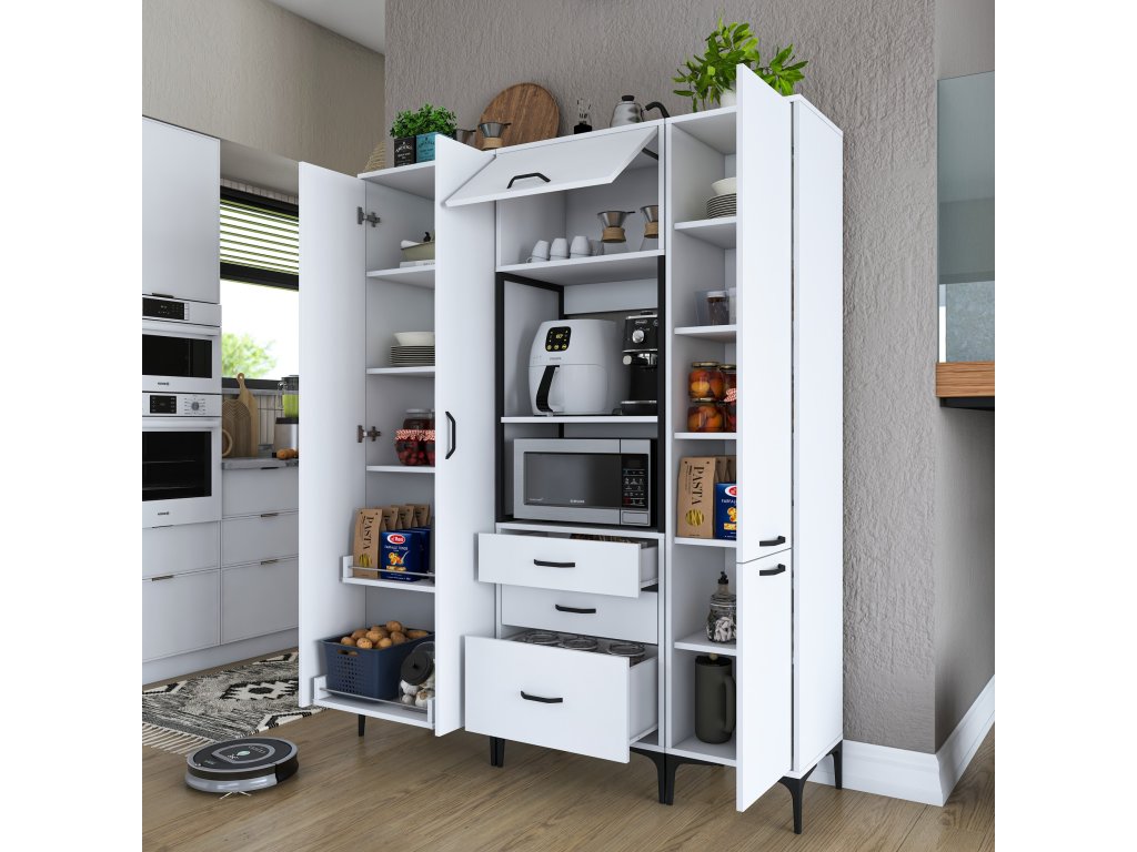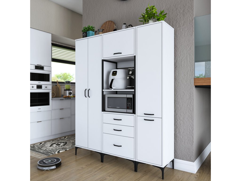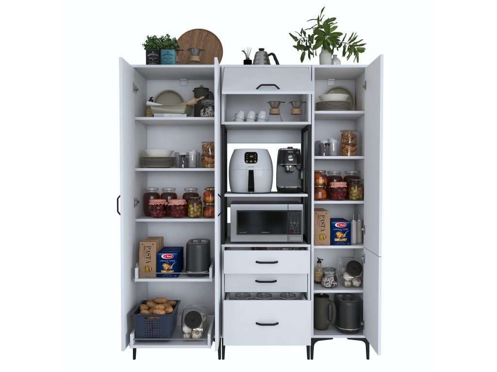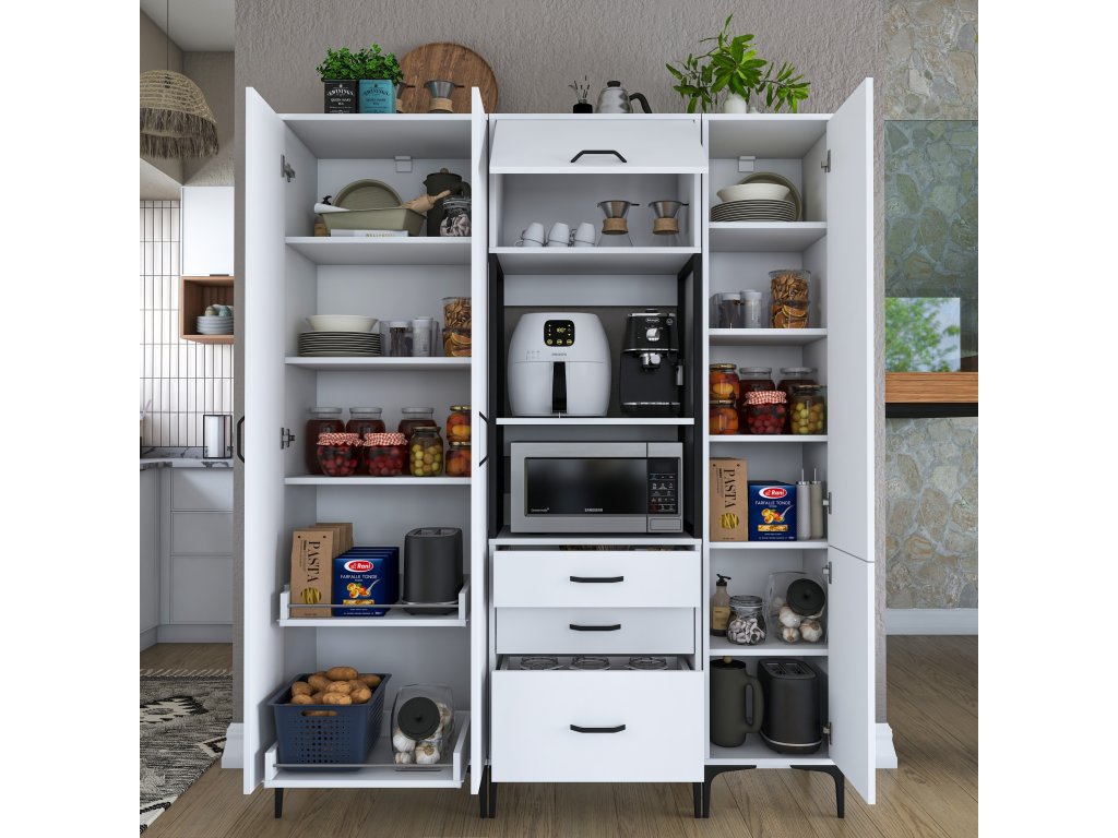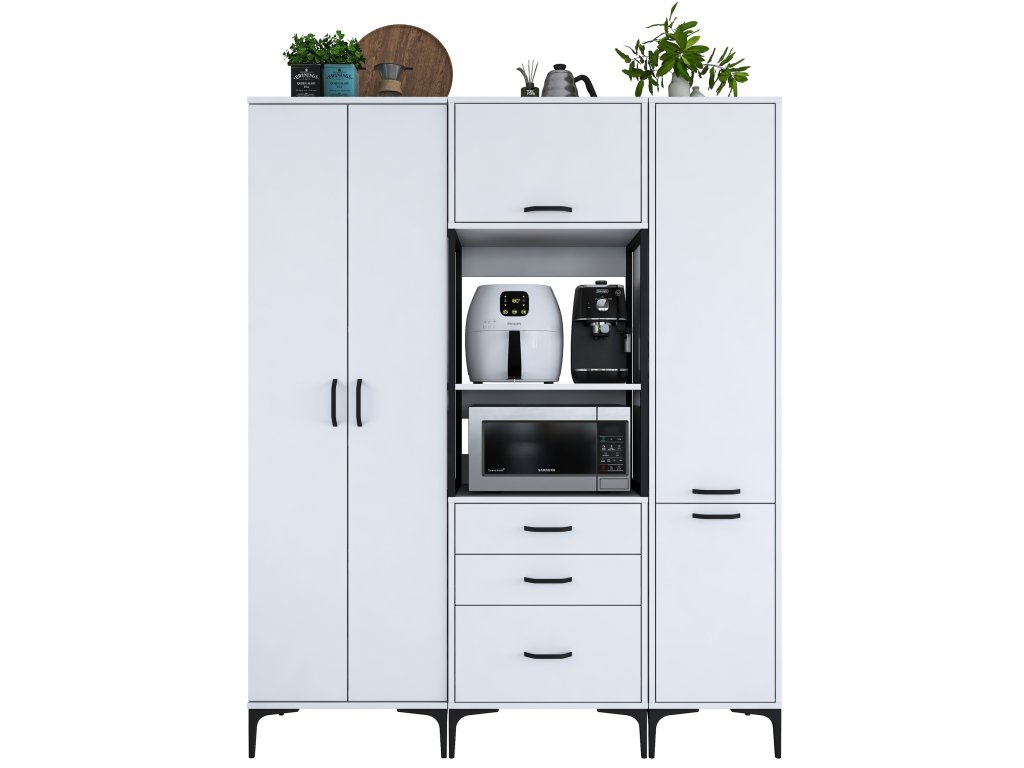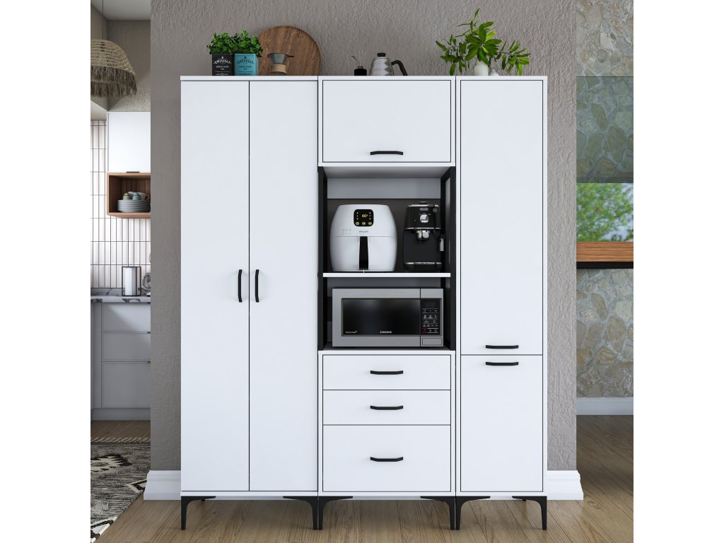 Skriňa LIFE ponúka premyslené usporiadanie úložného priestoru, ktoré zahŕňa päť plných dvierok, tri zásuvky a regál. Je navrhnutá tak, aby poskytovala dostatok miesta na mikrovlnnú rúru, kuchynské spotrebiče aj ďalšie predmety, ktoré potrebujete mať po ruke.