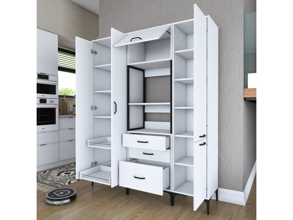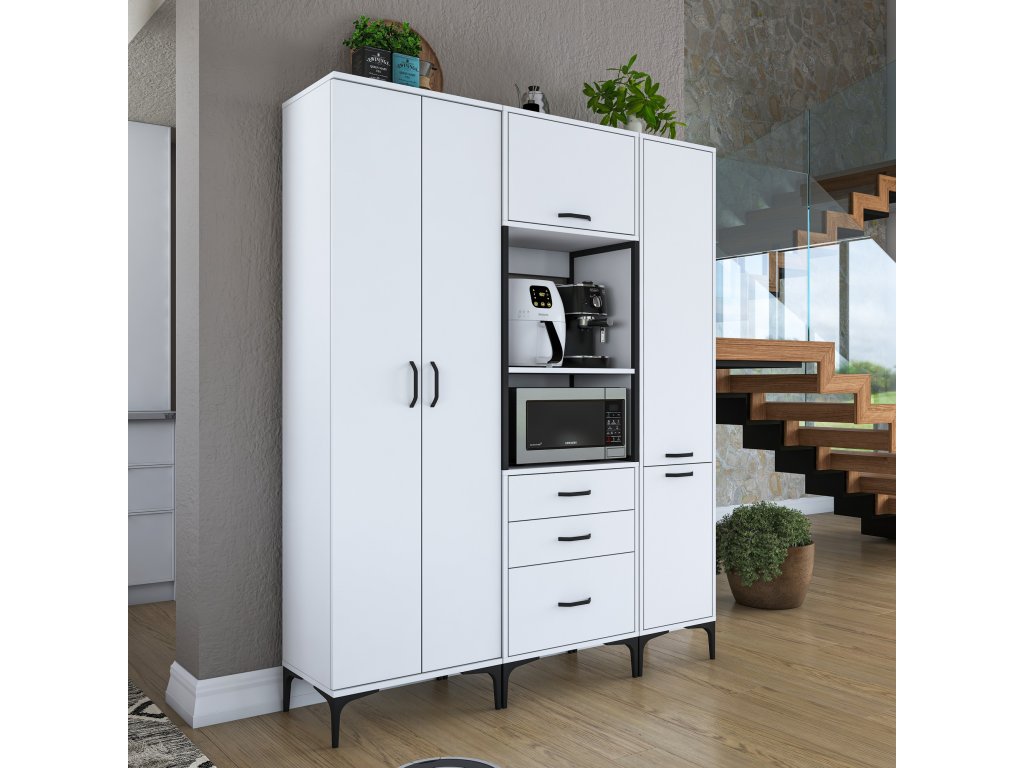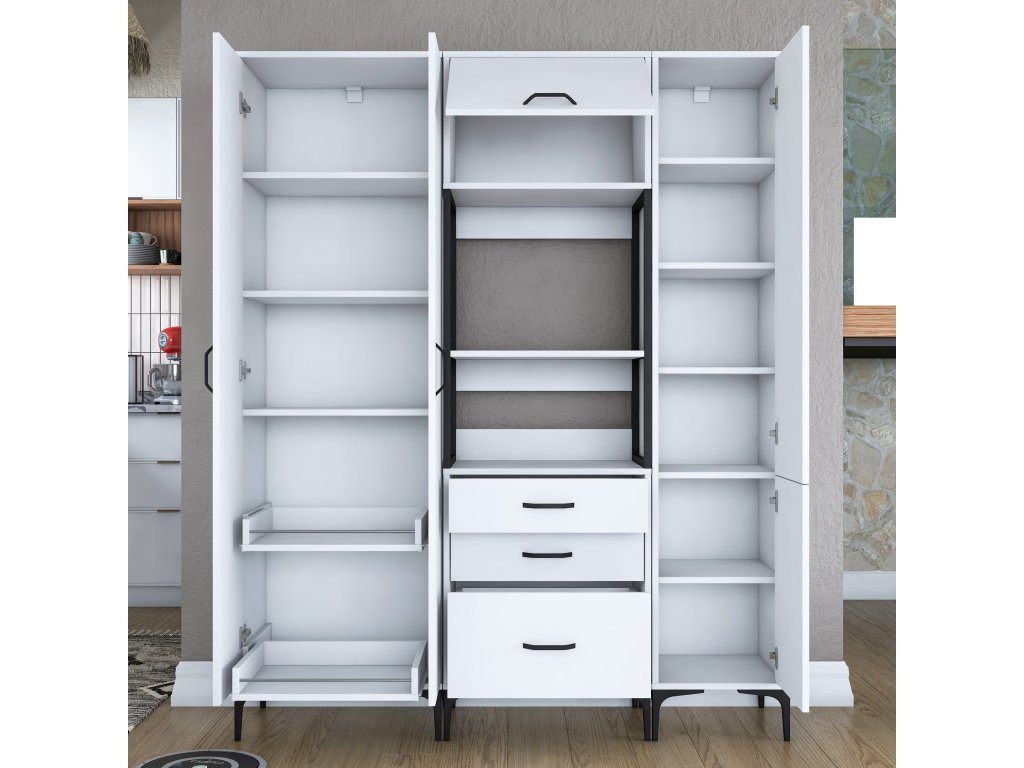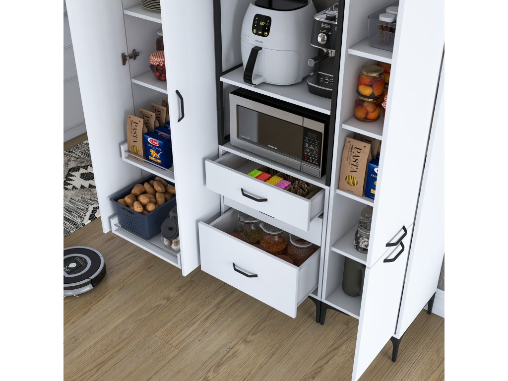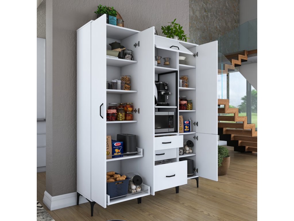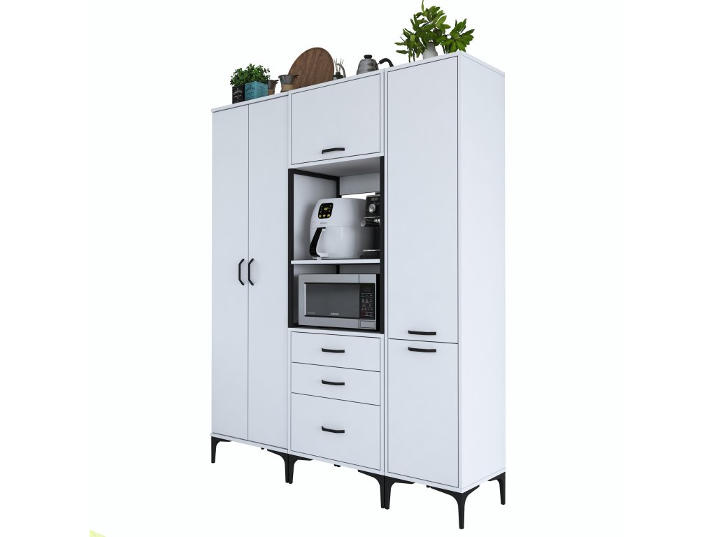 Skriňa LIFE ponúka premyslené usporiadanie úložného priestoru, ktoré zahŕňa päť plných dvierok, tri zásuvky a regál. Je navrhnutá tak, aby poskytovala dostatok miesta na mikrovlnnú rúru, kuchynské spotrebiče aj ďalšie predmety, ktoré potrebujete mať po ruke.
