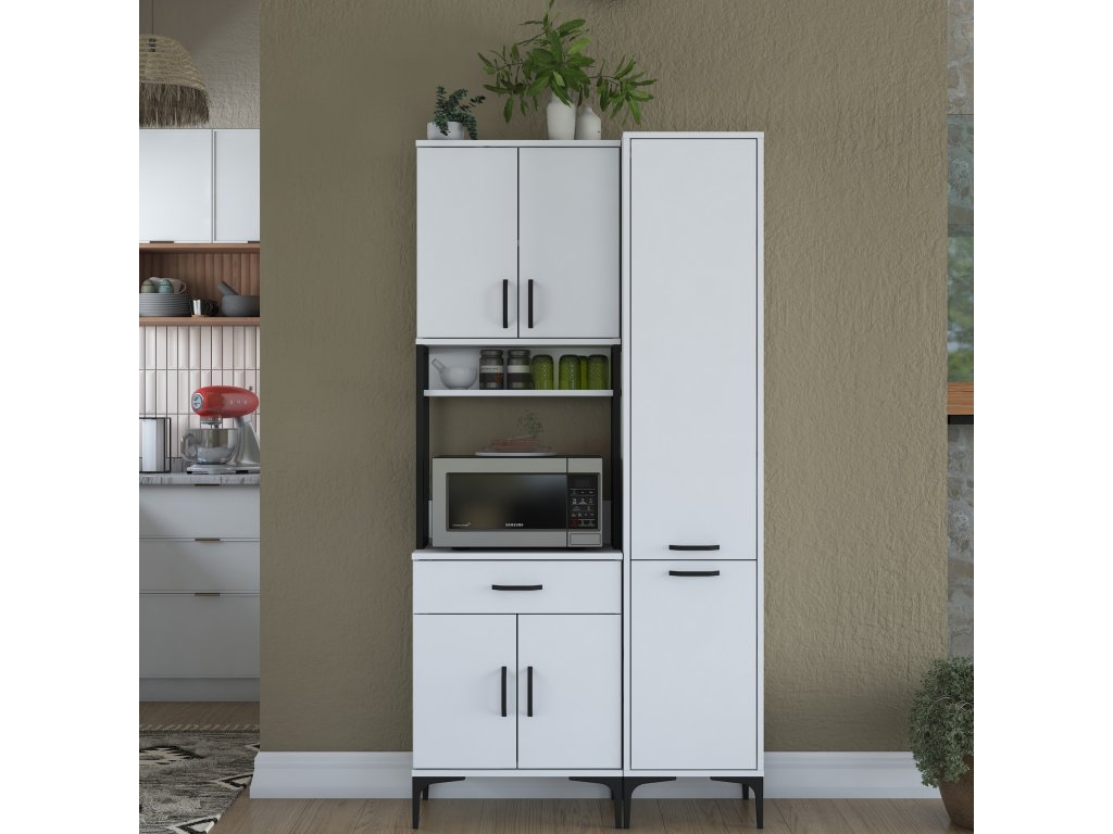 Skriňa MOOD ponúka praktický úložný priestor, ktorý zahŕňa päť plných dvierok, zásuvku a otvorený regál. Táto viacúčelová skriňa je navrhnutá tak, aby pojala mikrovlnnú rúru, kuchynské spotrebiče aj ďalšie predmety, ktoré chcete mať po ruke.