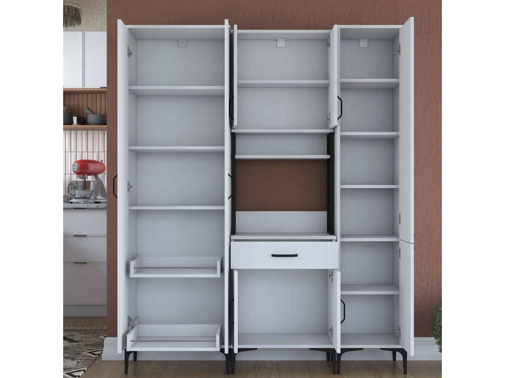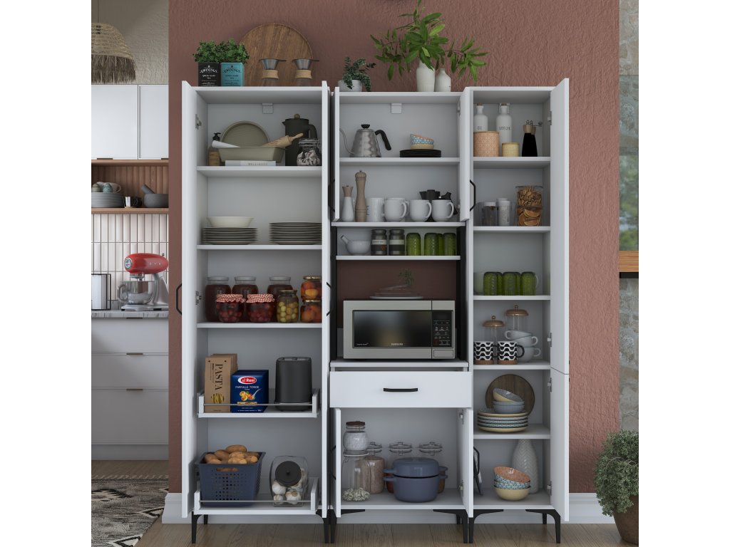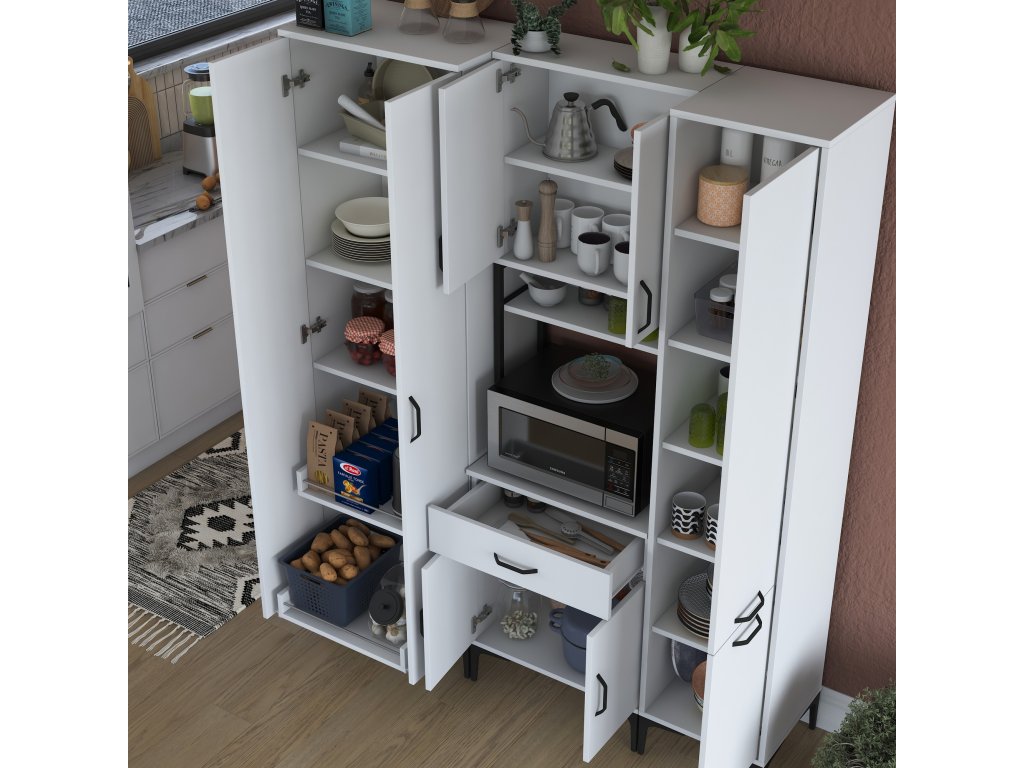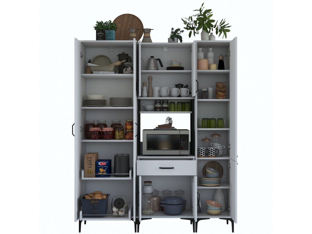 Skriňa NILE ponúka praktické usporiadanie vďaka ôsmim plným dvierkam, jednej zásuvke a regálku, ktorý je ideálny pre umiestnenie mikrovlnnej rúry alebo iných kuchynských spotrebičov. Viacúčelový dizajn poskytuje dostatok miesta na uloženie riadu, kuchynských potrieb a ďalších predmetov, ktoré chcete mať po ruke.