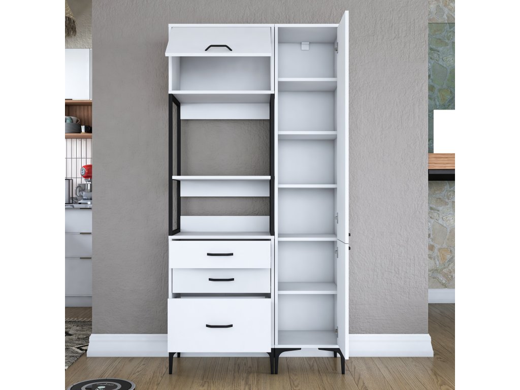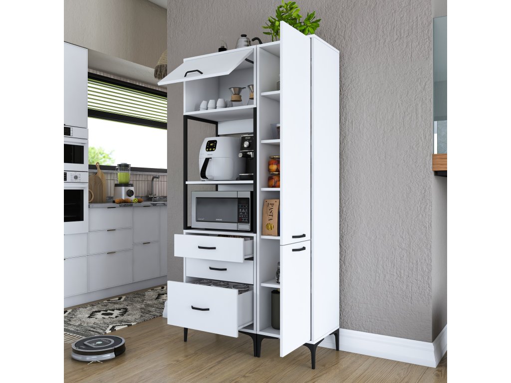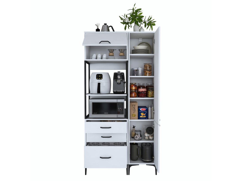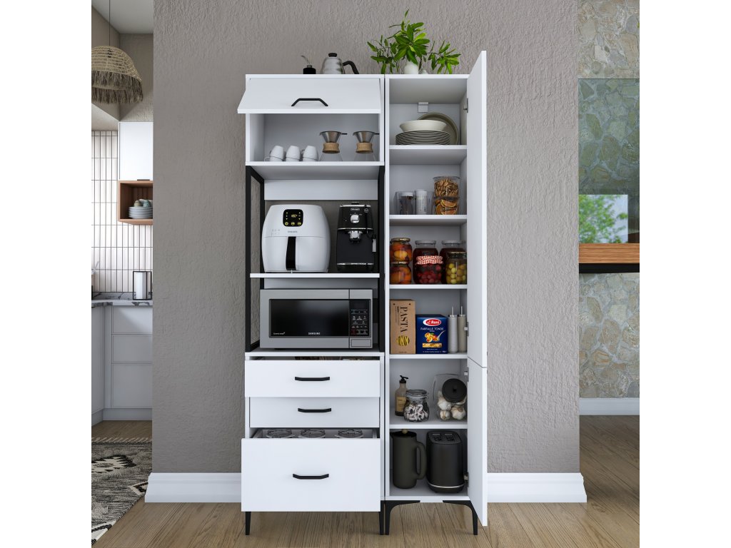 Skriňa TERI je vybavená tromi zásuvkami, plnými dvierkami a otvoreným regálkom, čo zaisťuje dostatok priestoru na uloženie kuchynských potrieb, riadu i ďalších predmetov. Jej viacúčelový dizajn sa hodí nielen do kuchyne, ale aj do iných miestností, kde je potrebné praktické usporiadanie.
