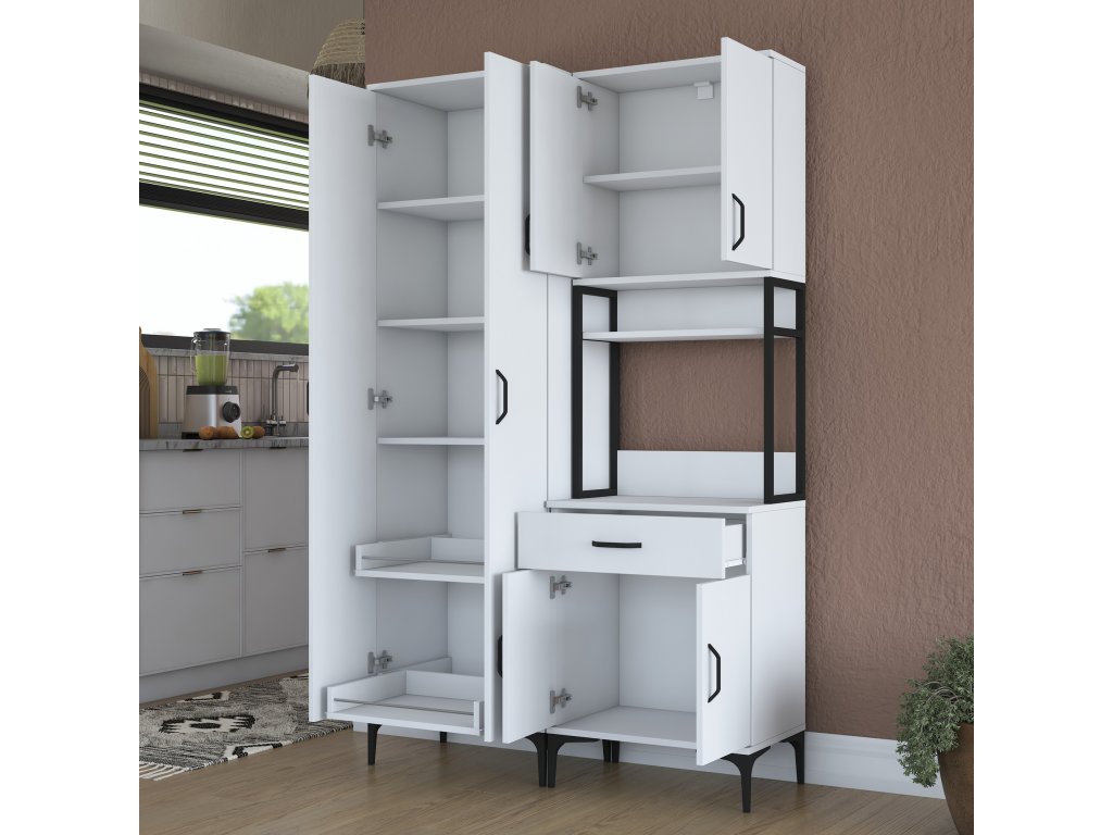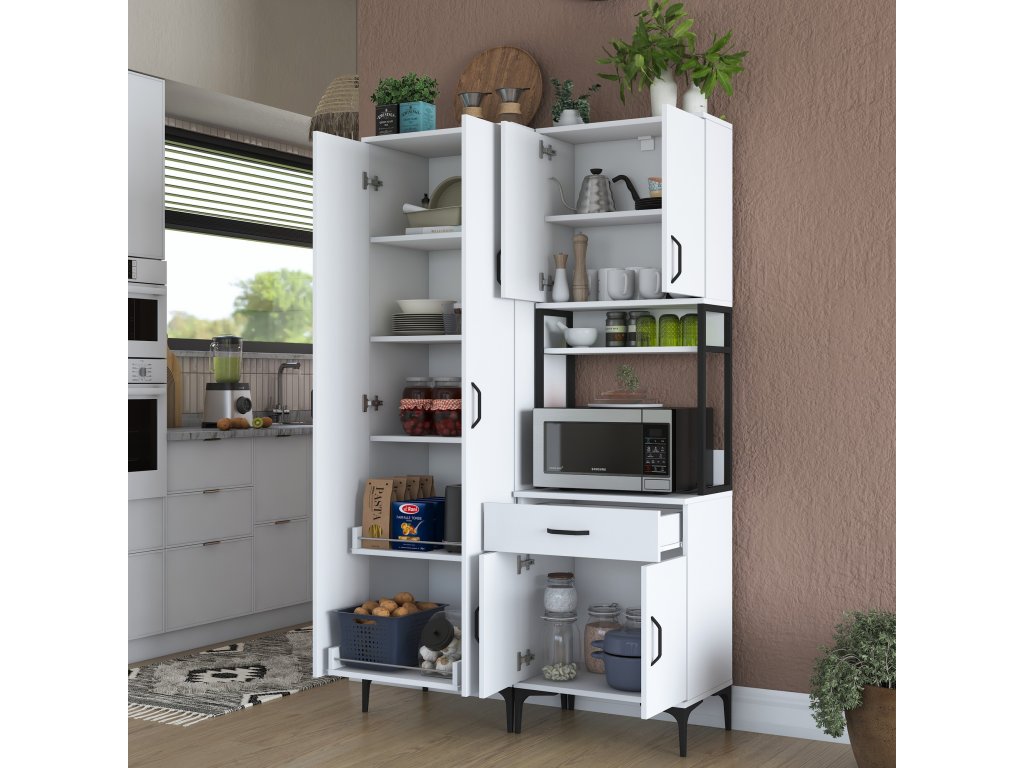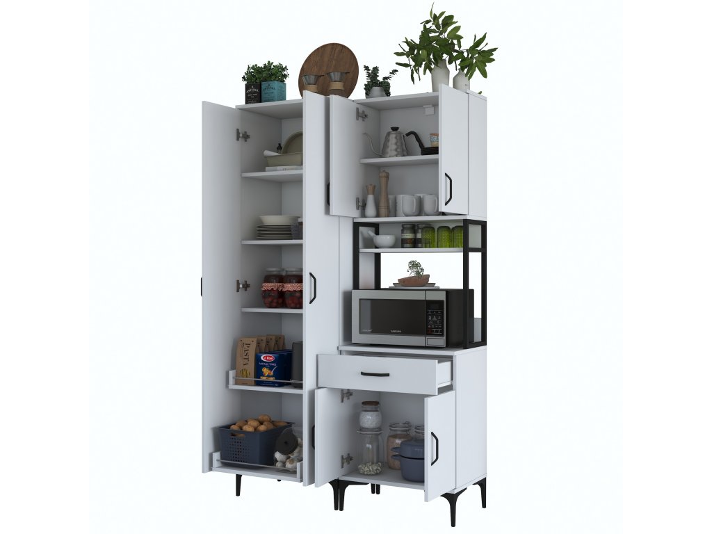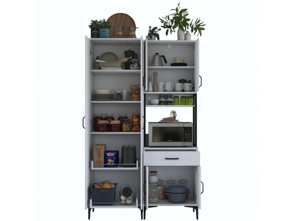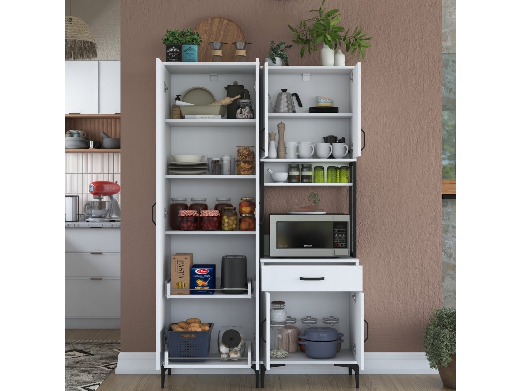 Skriňa VICTOR ponúka dostatok úložného priestoru vďaka šiestim plným dvierkam, jednej zásuvke a otvorenému regálku, ktorý je ideálny pre mikrovlnnú rúru alebo kuchynské spotrebiče. Tento praktický a viacúčelový dizajn umožňuje uloženie riadu, príslušenstva aj potravín na jednom mieste.